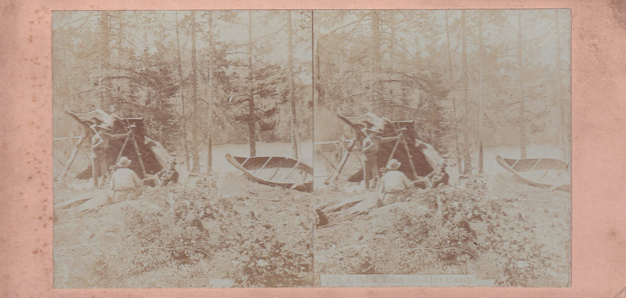 Black-and-White stereoview photograph of a group of people around a bark lean-to. A guideboat or canoe can be seen off to the side. Printed caption on photograph reads, "A Bark Lean-to - Our Camp." No photographer's mark. The location of this photograph is unknown. Mounted on tan cardboard backing.