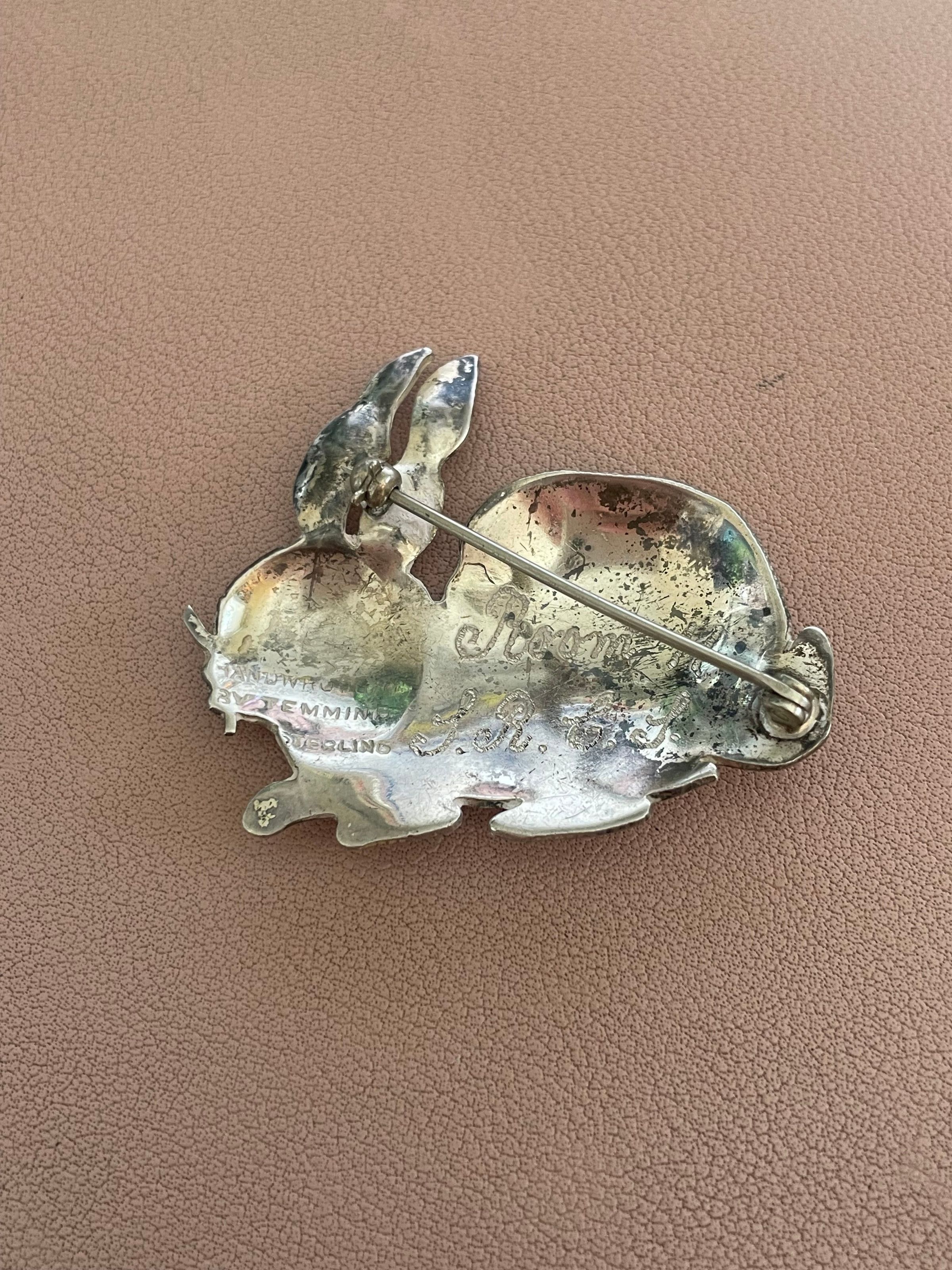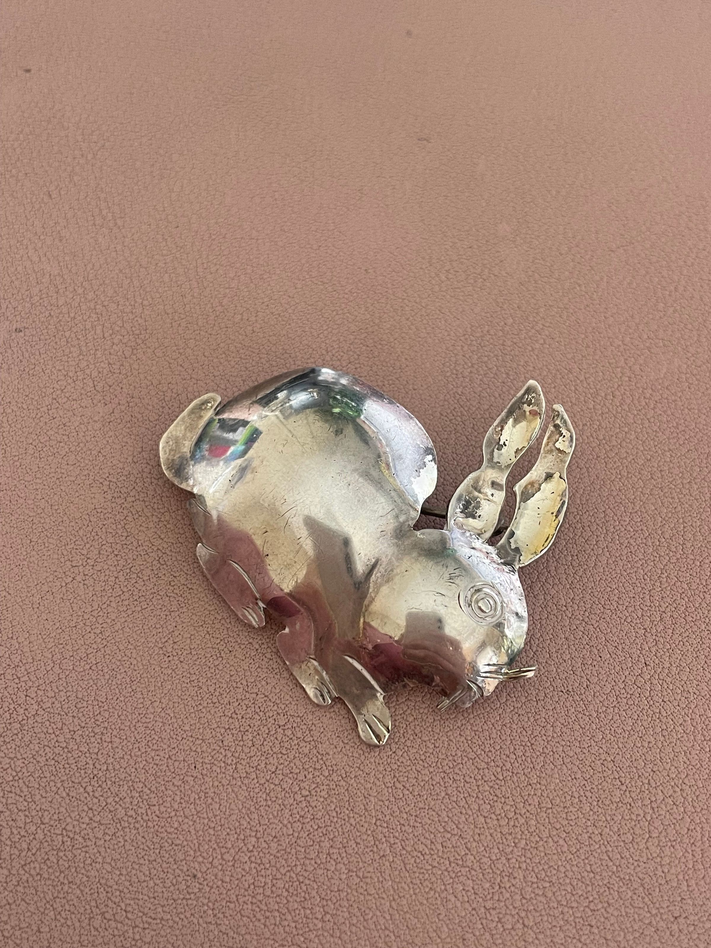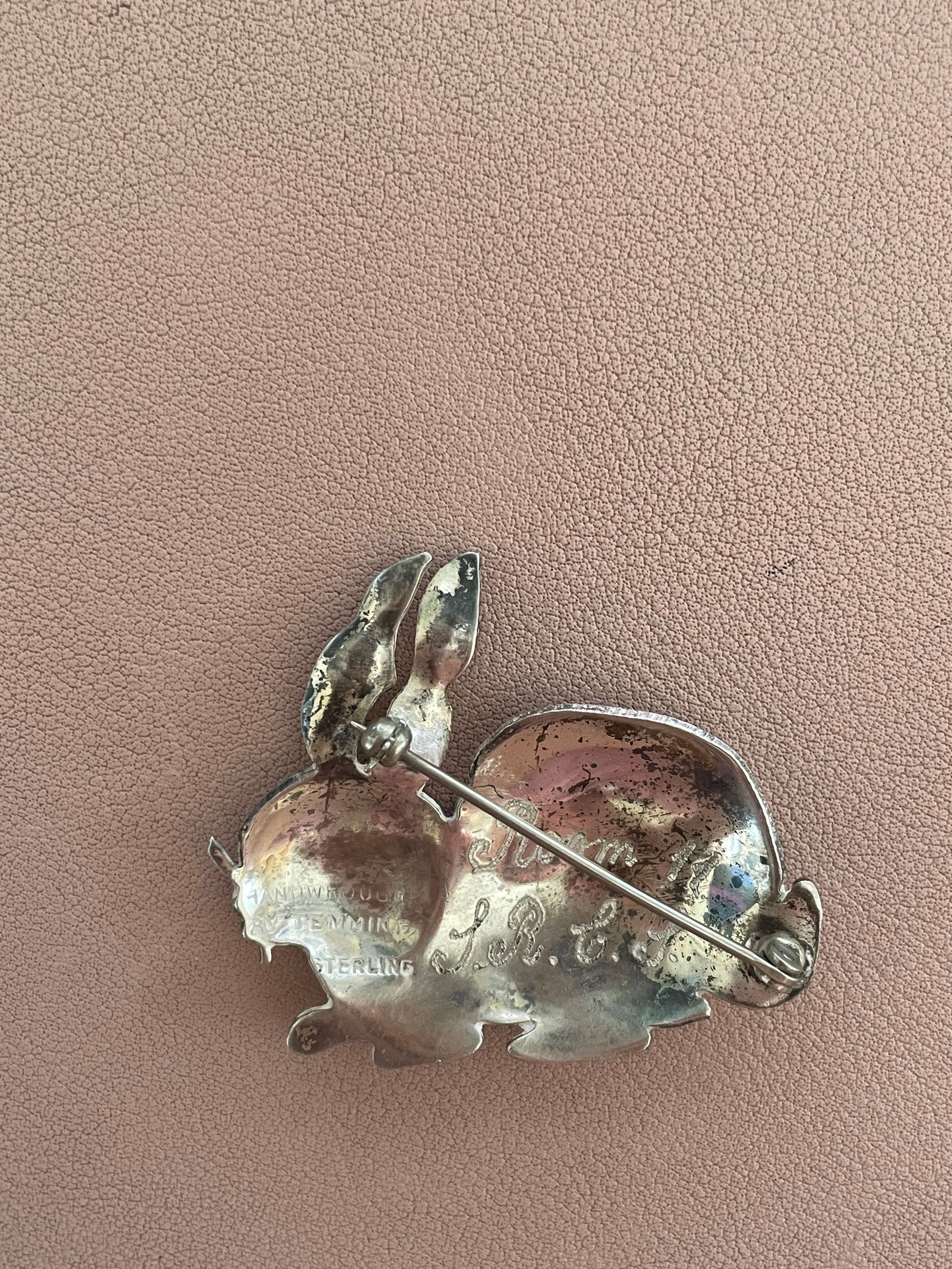 Sterling silver rabbit pin with bar back. "Handwrought by Temming. Sterling," is stamped on reverse. "Room 11. I.R. C.I. [?]" has been hand engraved on reverse.