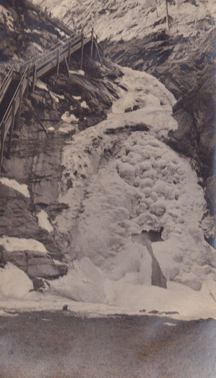 Black-and-white photograph of a stairway going down a rocky cliffside. The photograph was taken from the bottom of the cliff and also shows a frozen path of water going down the cliffside as well.