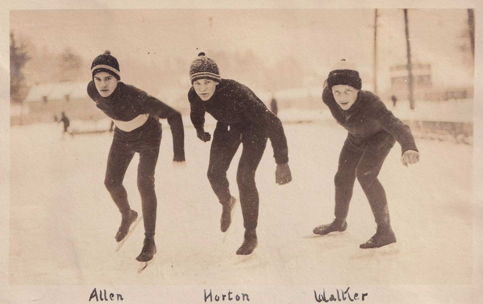 Black-and-white photograph of three young men posing in a skating positions and looking at the photographer. "Allen, Horton, Walker" is written a the bottom of the photograph, one name under each person.