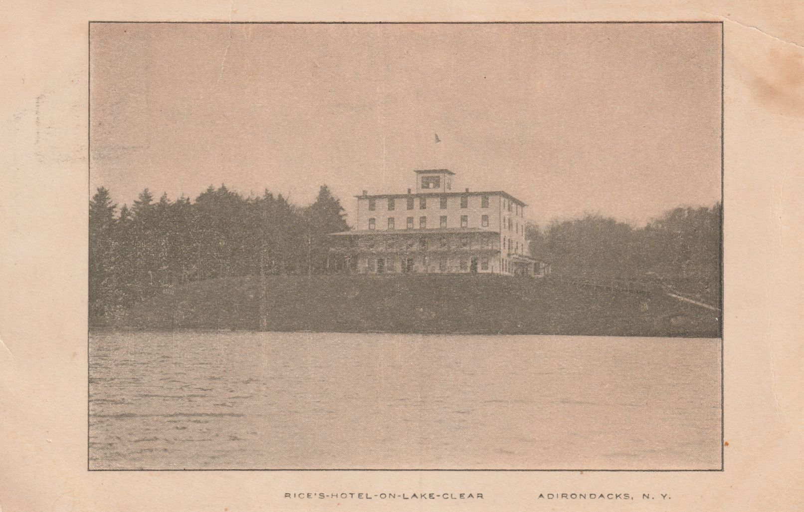 Black-and-White postcard showing a large hotel building on the shore of a body of water. Printed caption on front reads, "Rice's Hotel on Lake Clear, Adirondacks, N. Y." Printed by Adirondack Enterprise, Saranac Lake. Used, divided back, large white border, no postmarked.