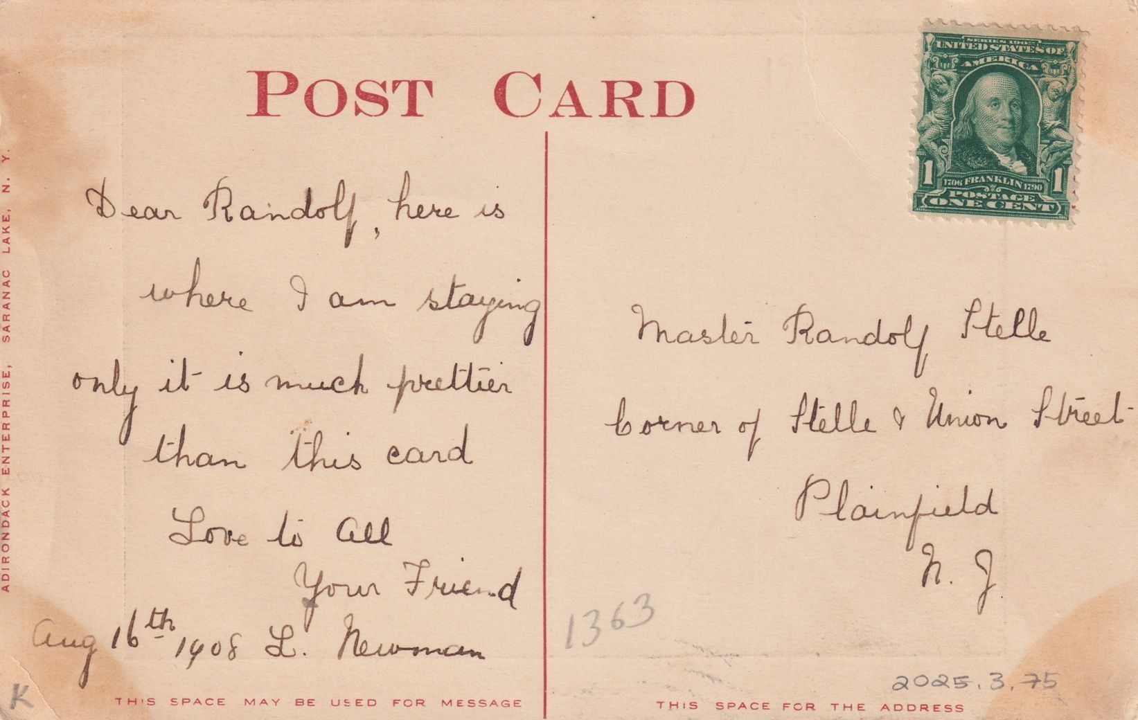 Handwritten message on reverse reads, "Dear Randolf, here is where I am staying only it is much prettier than this card. Love to all, your friend, l> Newman. Aug. 16th, 1908." Mailed to Master Randolf Stelle, Corner of Stelle & Union Street, Plainfield, NJ.Subject Place