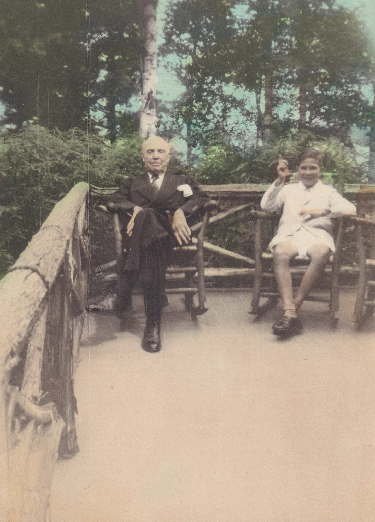 Hand-colored photograph of Farnham and Jay Yardley on a porch at Bartlett Carry Club. Handwritten note on reverse reads, "Camp Waubenoo, August 1948."