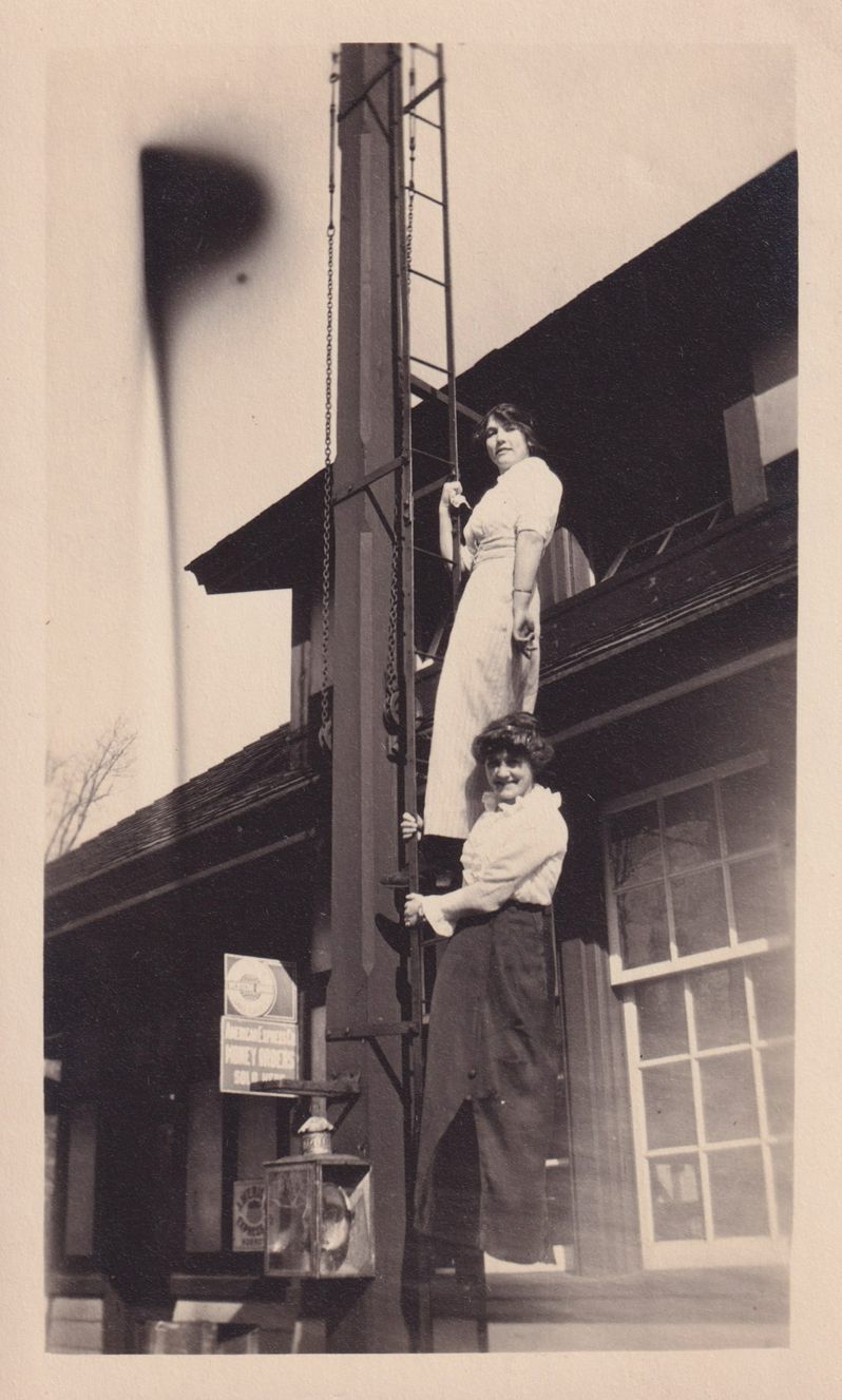 Black-and-White photograph of two women climbing a ladder on a large metal pole, possibly at a railroad station. There is a signal lamp mounted on the side of the pole and an American Express sign on the building behind them. The photograph was likely printed by Kollecker's Kodak and Gift Shop.
