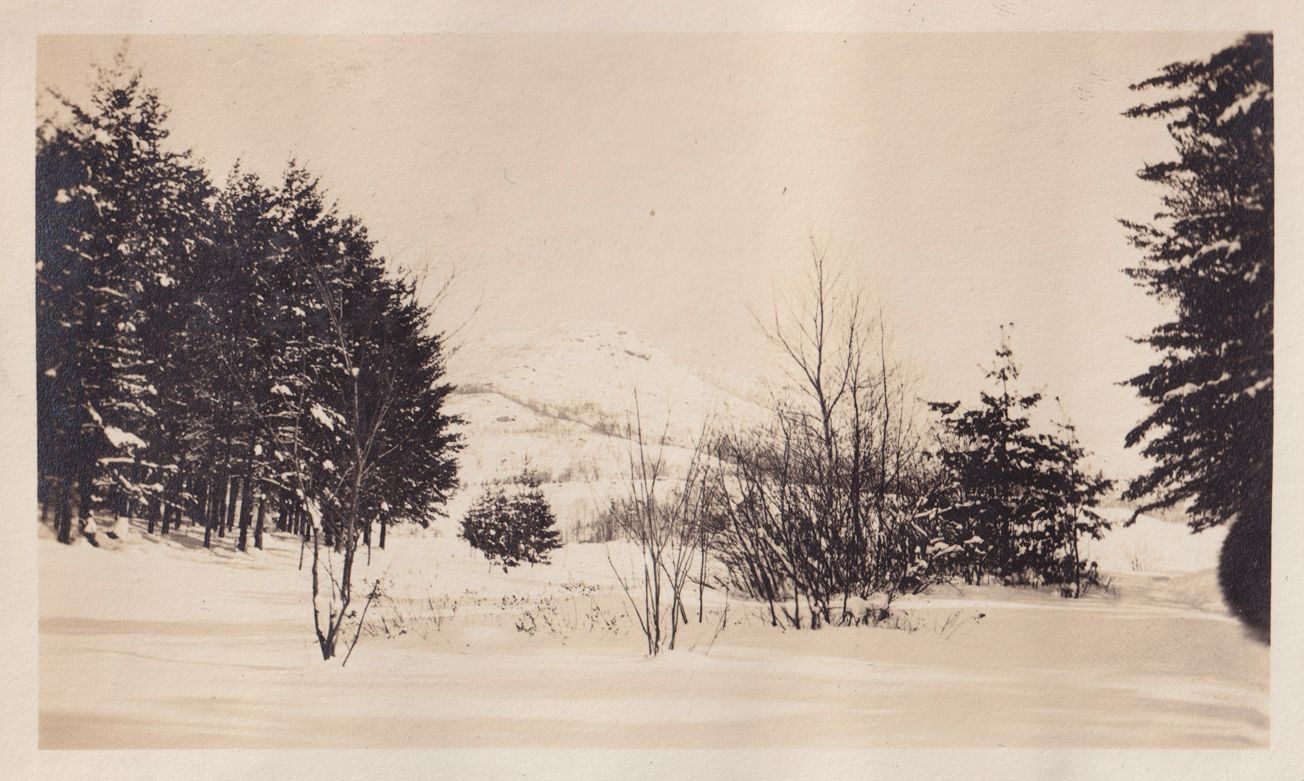 Black-and-white photograph of a snow-covered outdoor area. There are trees on either side of the photograph, with an almost clear path between them with a mountain visible between the tree lines.