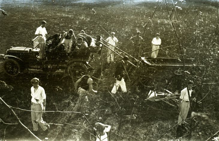 Negative of a group of unidentified young men loading wood into a wagon attached to a buggy. Most likely taken by Mary Ives Baldwin. This item is not fully cataloged but has been uploaded so the image is publicly available; if you would like us to prioritize cataloging this item, please contact the HSL Collections team.