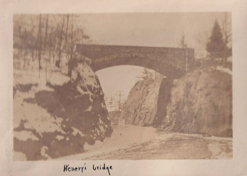 Black-and-white photograph of a brick bridge running over a river. There is snow covering the ground on either side of the bridge. "Hellery's bridge" is written in ink beneath the photograph.