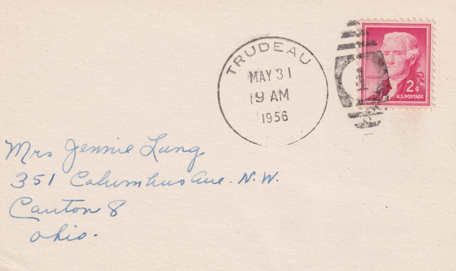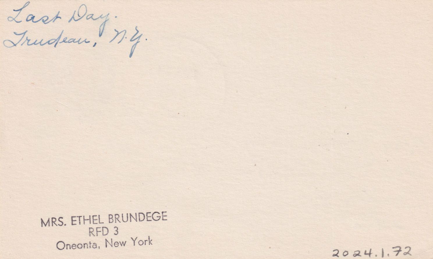 Blank card mailed from the last day of operations at the post office at Trudeau, NY. Handwritten on front is, "Last Day. Trudeau, N.Y." and "Mrs. Ethel Brundege, RFD 3, Oneonta, New York," is stamped at bottom. Postmarked Trudeau, NY, May 31, 1956. Mailed to Mrs. Jennie Lung, 351 Calumbus Ave., N. W., Canton 8, Ohio.Subject Place