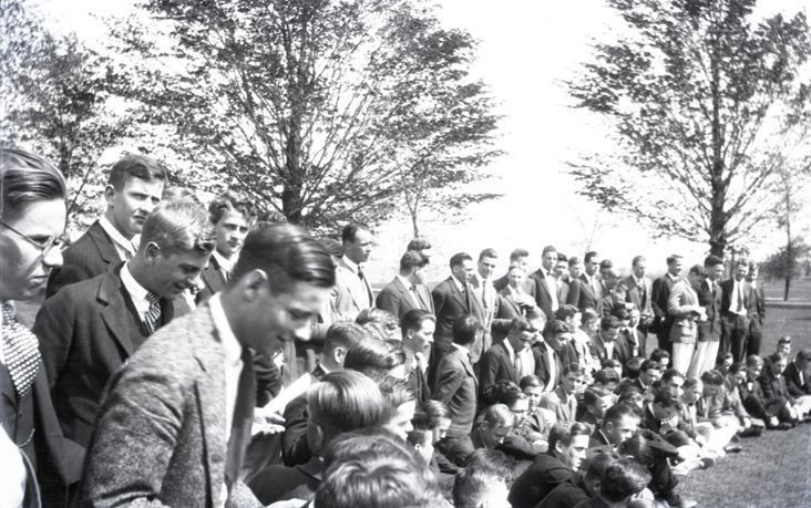 Negative of a crowd of young men in suit jackets standing and sitting in four lines for a group photograph. The photographer is standing among them, so the photo was most likely taken by Henry Ives Baldwin. This item is not fully cataloged but has been uploaded so the image is publicly available; if you would like us to prioritize cataloging this item, please contact the HSL Collections team.