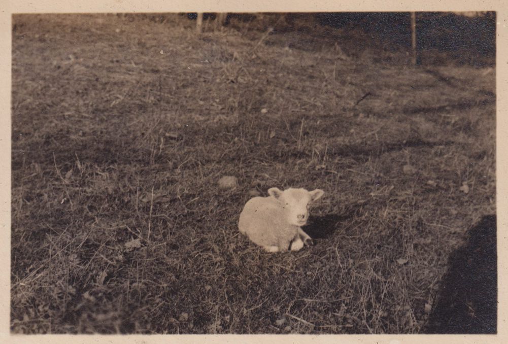 Black-and-White photograph of a lamb laying in the grass. Part of album 2024.21.1, kept by Amy Jones and David Blair Jones c. 1930-1934.