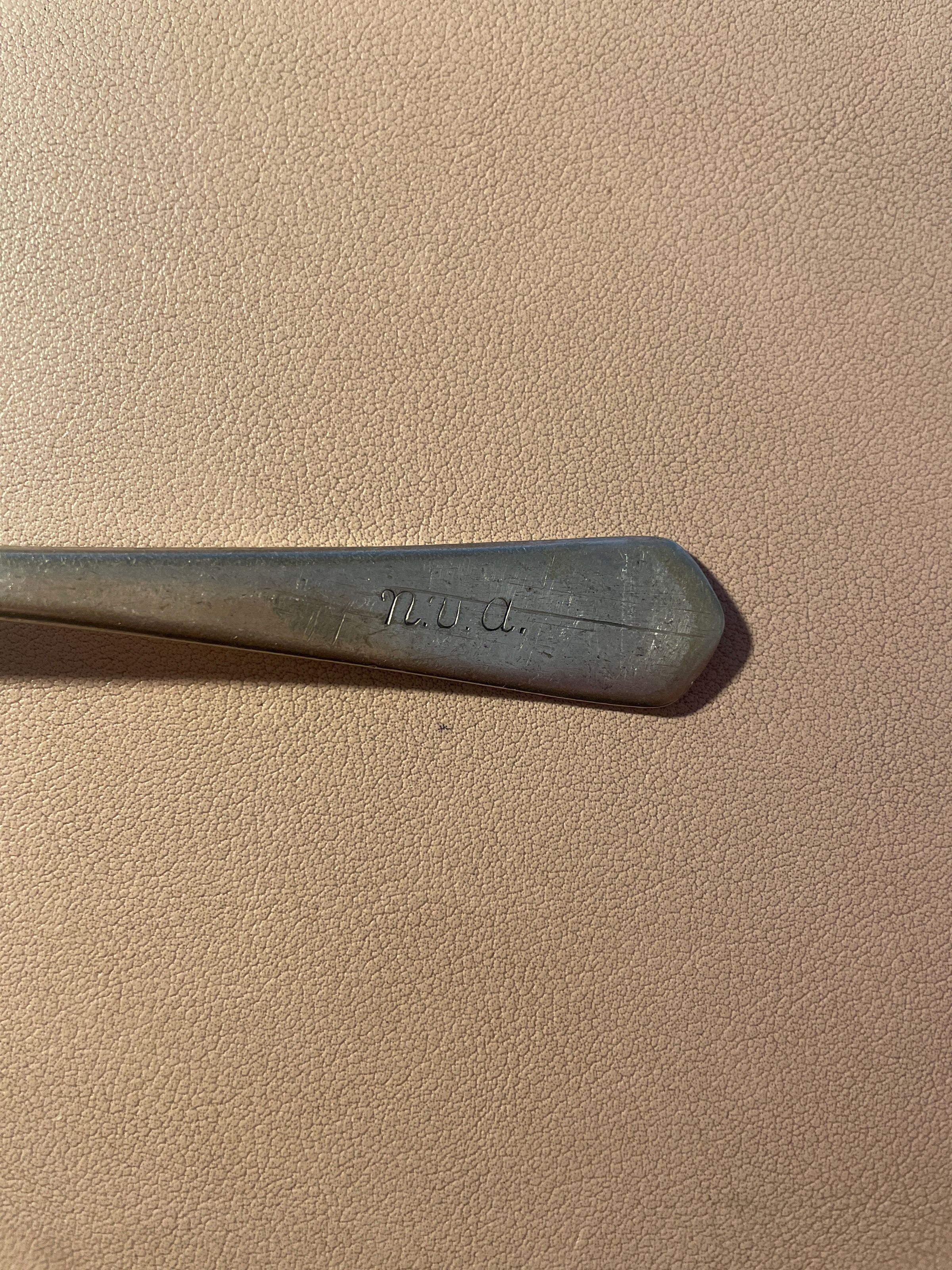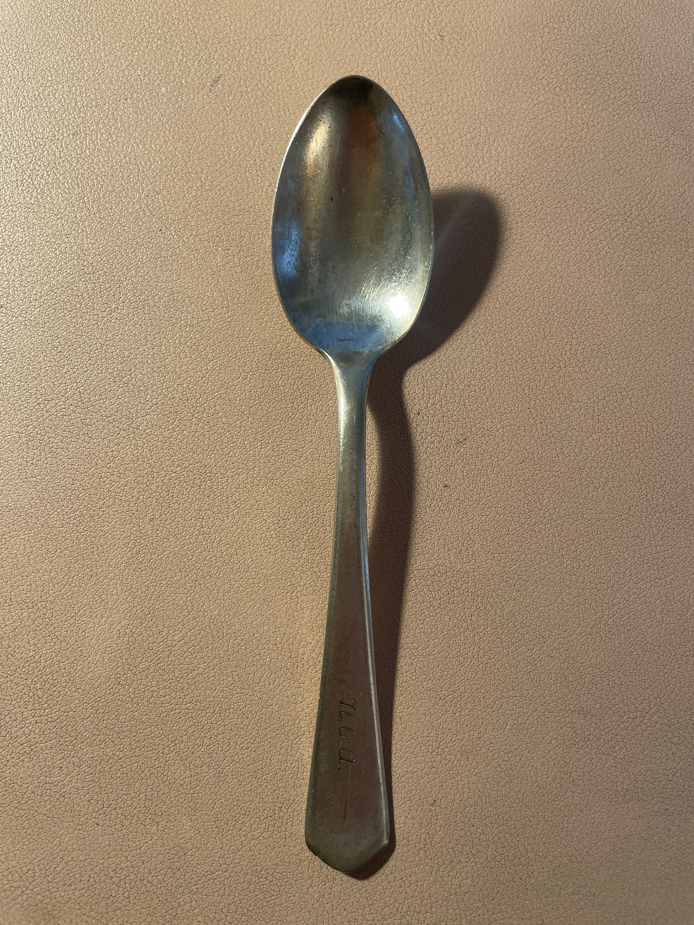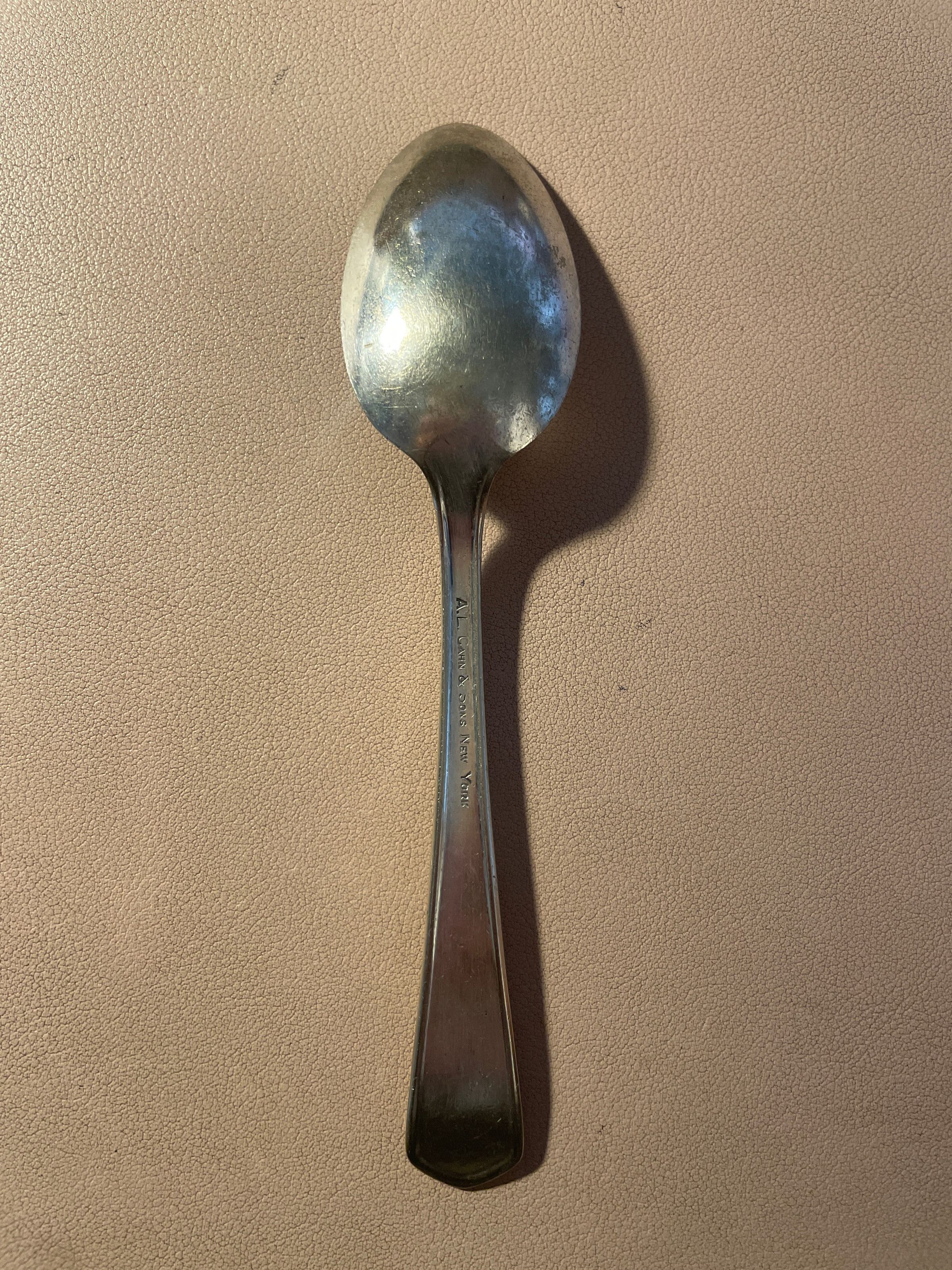 Silver teaspoon from the National Vaudeville Artists' Home (later renamed Will Rogers Hospital). "N. V. A." is stamped on the handle, and "A.L. Cahn & Sons New York," is stamped on the reverse.