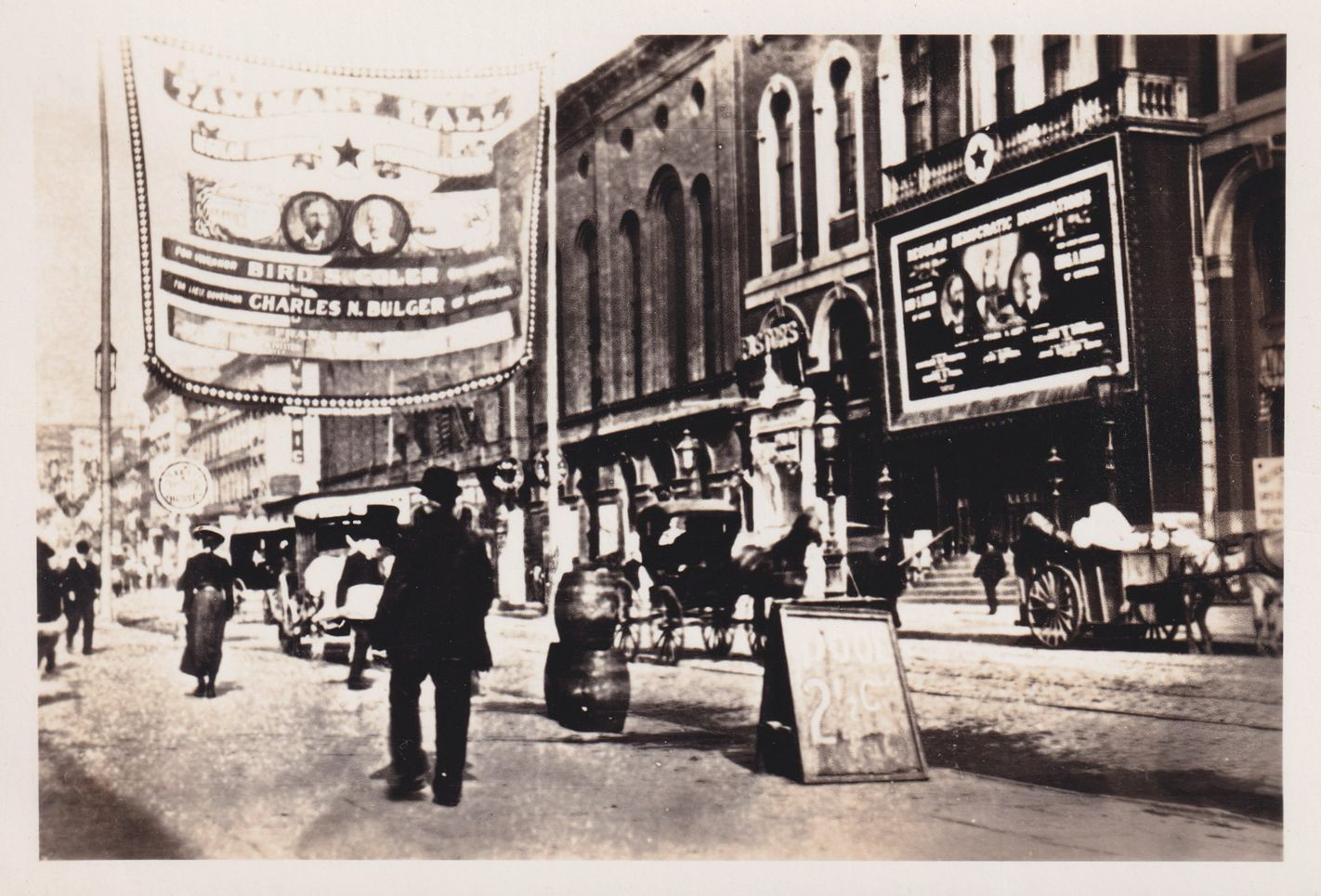 Black-and-White photograph of an unidentified downtown street. A Tammany Hall banner can be seen above the street. Poor print quality indicates this may be reprinted from another photograph. Photograph was likely printed by Kollecker's Kodak and Gift Shop.