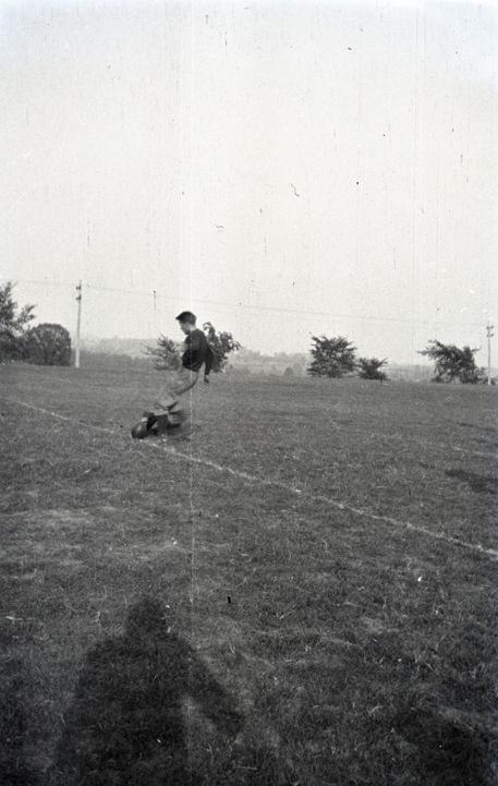 Negative of a kicker about to kick a football during a game. Most likely taken by Mary Ives Baldwin. This item is not fully cataloged but has been uploaded so the image is publicly available; if you would like us to prioritize cataloging this item, please contact the HSL Collections team.