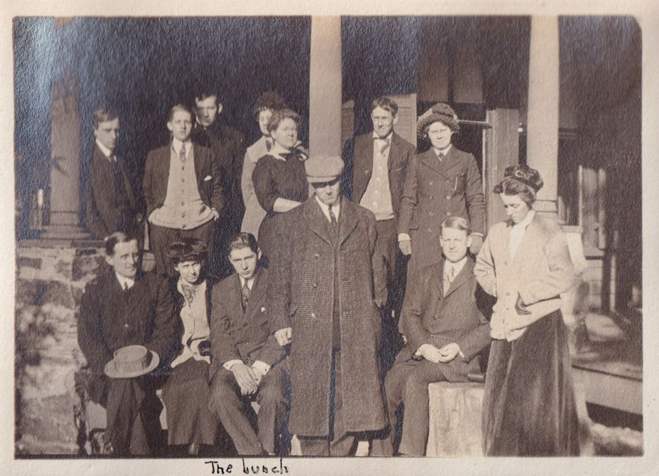 Black-and-white photograph of five women and eight men standing or sitting in a group on the front steps of a building. "The bunch" is written in ink beneath the photograph.