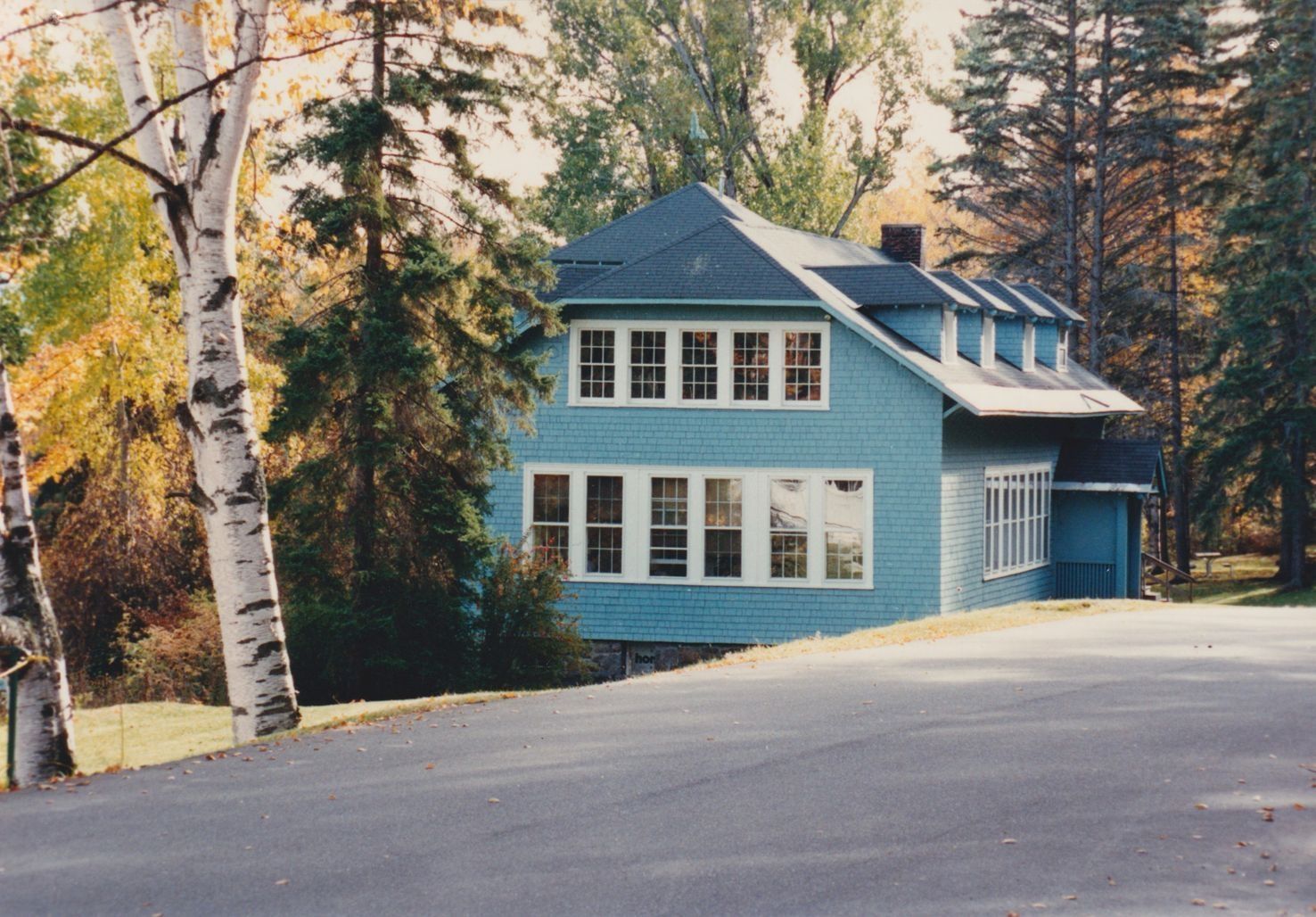Color photograph of a building surrounded by fall foliage. The building was the Scholfield Memorial Workshop when it was part of the Trudeau Sanatorium, but at the time of the photograph it was part of the American Management Association grounds.