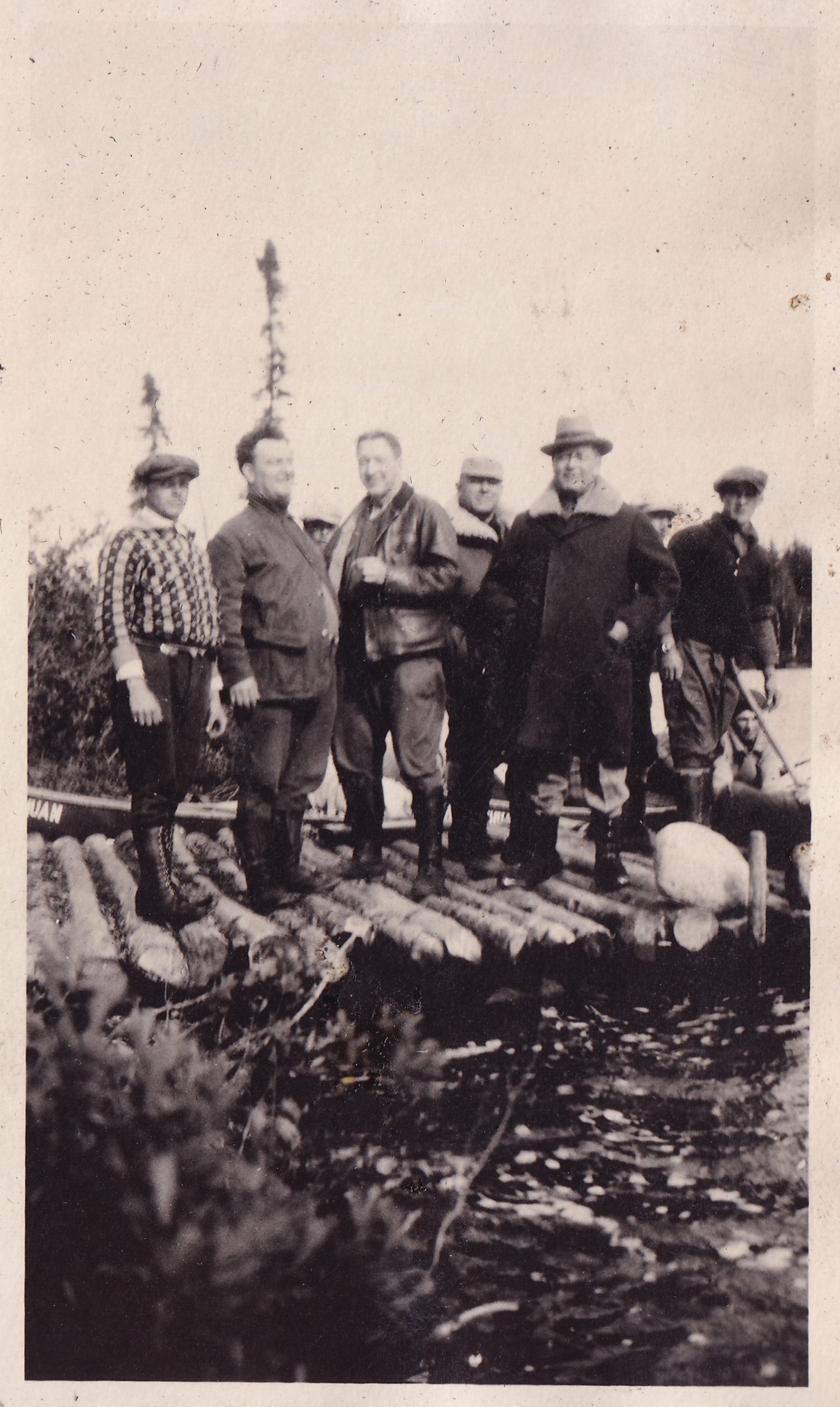Black-and-White photograph of a group of men standing on a log dock. Several men are visible in a canoe or boat behind them.