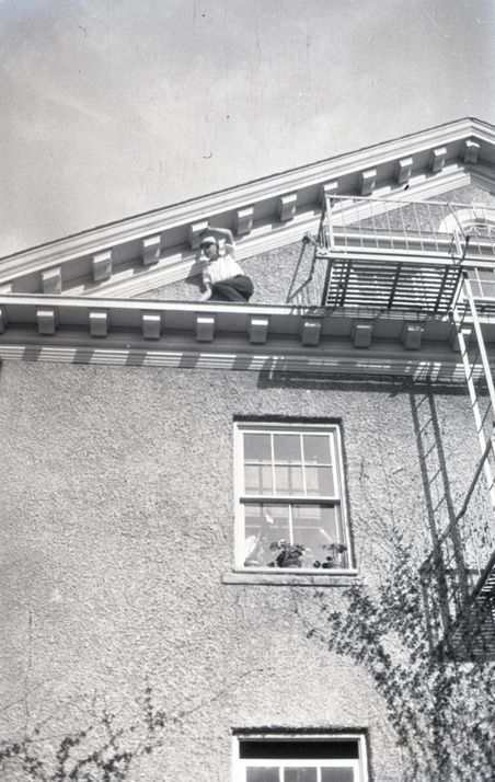Negative of an unidentified young men standing on a ledge against the gable of a stucco-sided building. Most likely taken by Mary Ives Baldwin. This item is not fully cataloged but has been uploaded so the image is publicly available; if you would like us to prioritize cataloging this item, please contact the HSL Collections team.