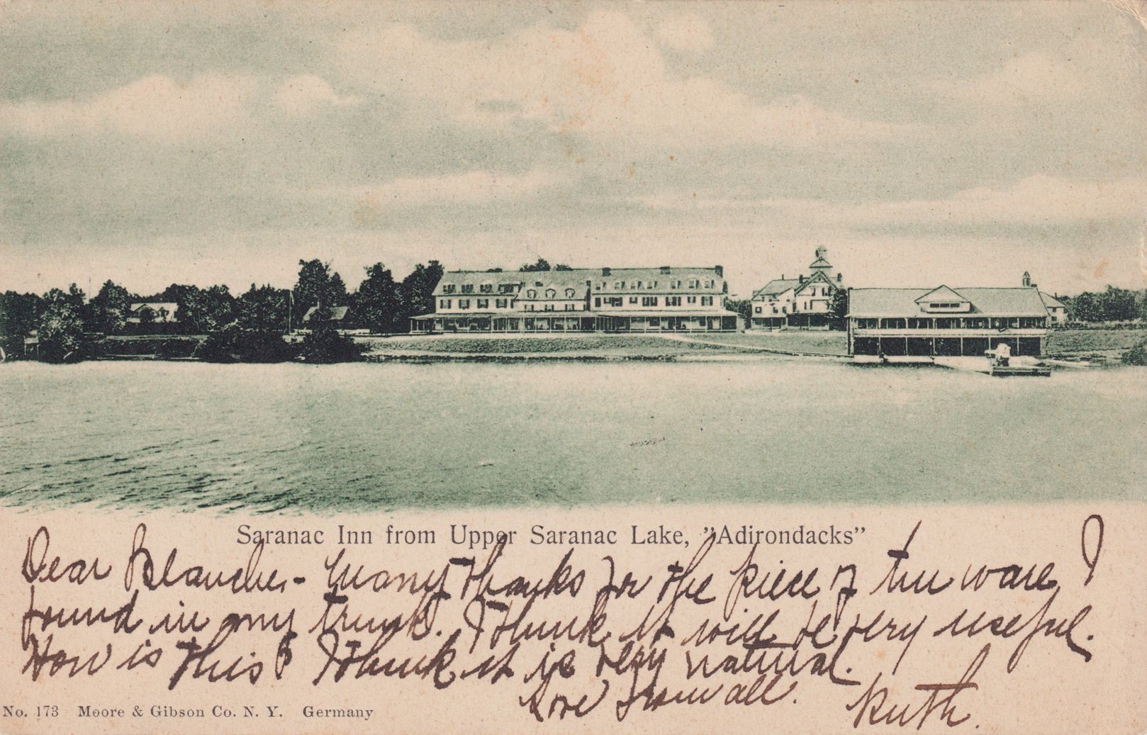 Green-toned postcard showing Saranac Inn seen from Upper Saranac Lake. Printed caption on front reads, "Saranac Inn from Upper Saranac Lake, 'Adirondacks'." Printed by Moore & Gibson Co., N. Y. Used, undivided back, white space on front for message, postmark illegible.