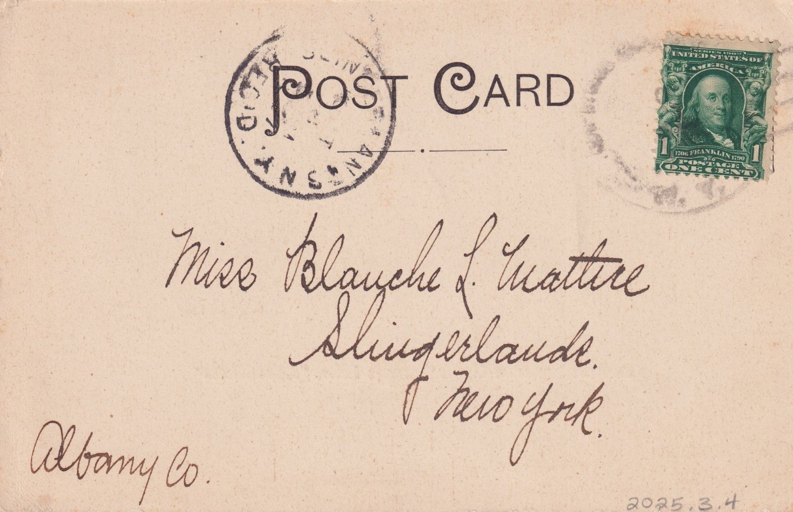 Handwritten message on front reads, "Dear Blanche - Many thanks for the piece of truware [?]. I found it in my things. I think it will be very useful. How is this? I think it is very natural. Love from all. Ruth." Mailed to Miss Blanche L. Maltire, Slingerlands, New York.Subject Place