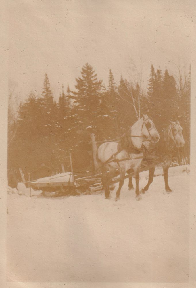 Black-and-White photograph of a horse-drawn ice sled on Ampersand Bay. Part of album 2024.21.1, kept by Amy Jones and David Blair Jones c. 1930-1934.