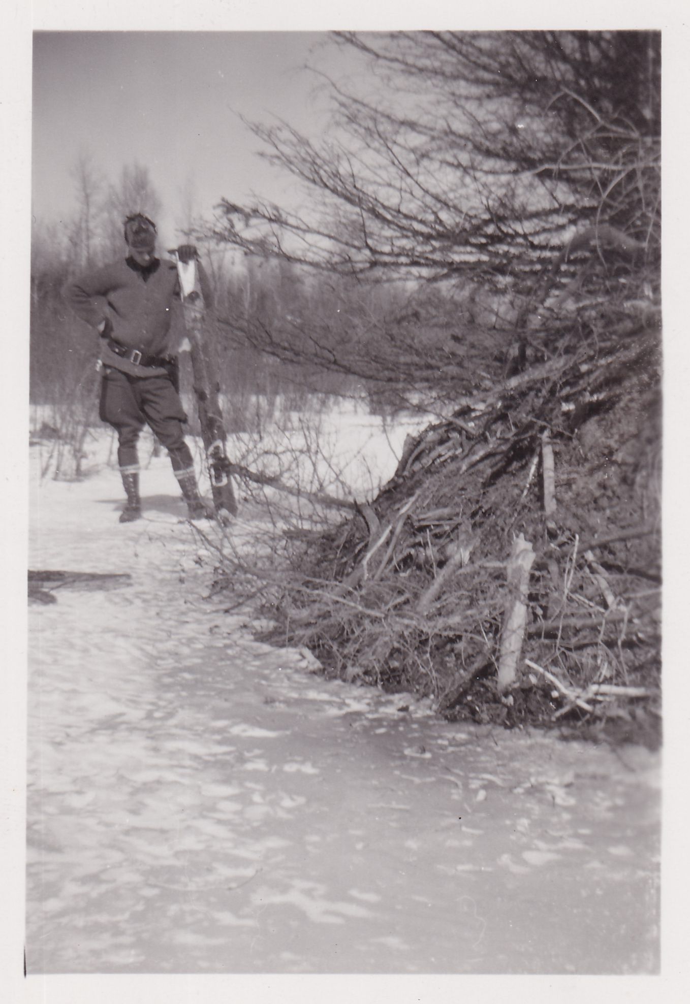 Black-and-White photograph of a man in a game warden uniform holding a large stick with a trap mounted to it. There is a large beaver dam in the foreground.