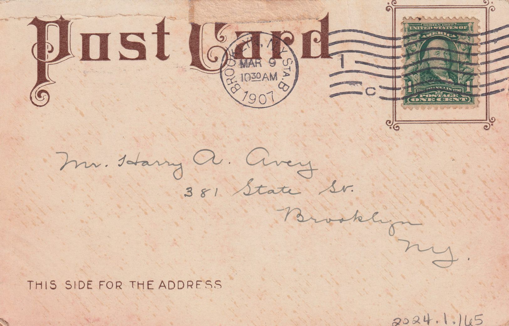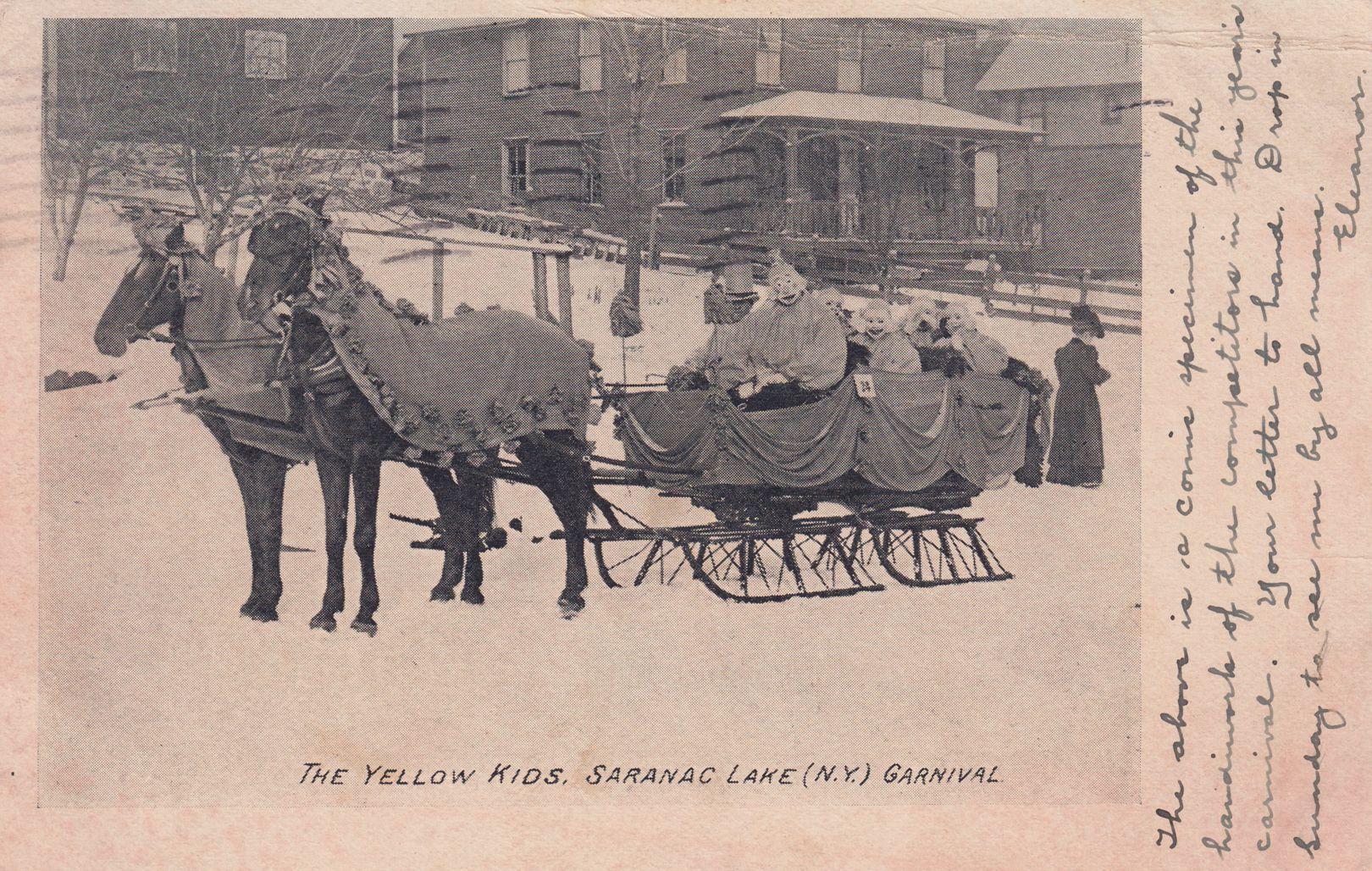 Black-and-white postcard of a float in the Winter Carnival parade, c. 1907. The float is a horse-drawn sleigh, and several people in masks are seated in the sleigh. Several unidentified houses can be seen in the background. Printed caption on front reads, "The Yellow Kids, Saranac Lake, (N.Y.) Carnival." No printer's mark. Used, undivided back, white border, space for message on front side, postmarked Brooklyn, NY, March 9, 1907. Handwritten message on front reads, "The above is a comic specimen of the handiwork of the competitors in this year's carnival. Your letter to hand. Drop in Sunday to see me by all means. Eleanor." Mailed to Mr. Harry A. Avery, 381 State St., Brooklyn, NY.Subject Place