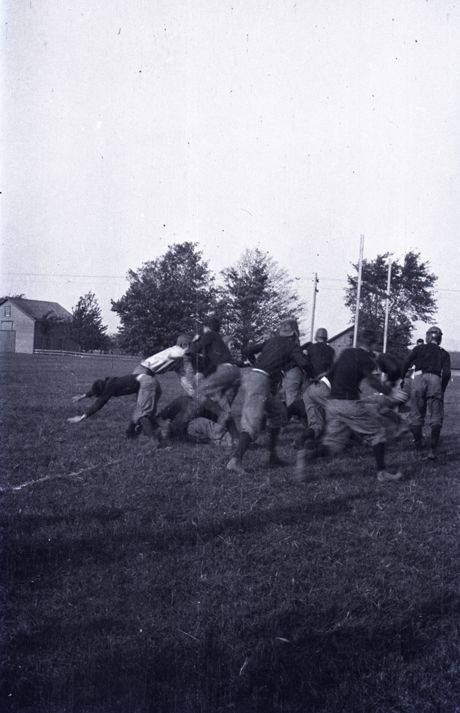 Negative of a football game taken from behind the line of one team as the collide with the other. Most likely taken by Mary Ives Baldwin. This item is not fully cataloged but has been uploaded so the image is publicly available; if you would like us to prioritize cataloging this item, please contact the HSL Collections team.