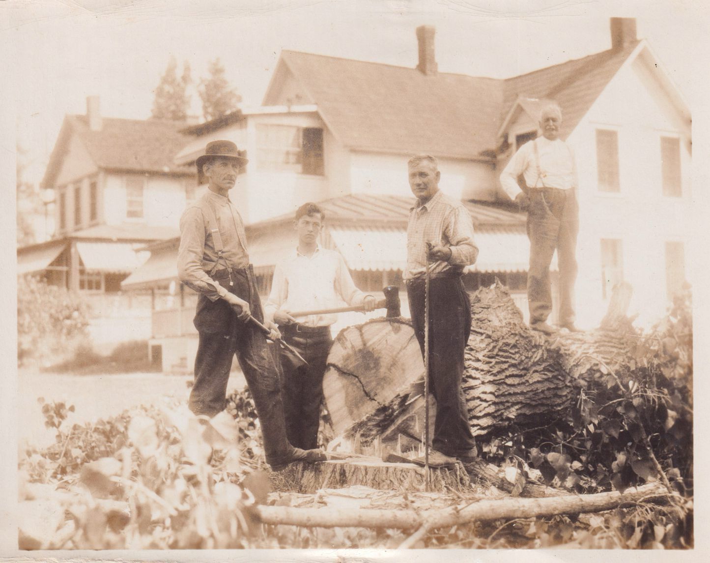 Black-and-White photograph of four unidentified men standing around and on top of a large felled tree. Three of them are holding saws or axes. There are two houses with cure porches visible in the background. The photograph was likely printed by Kollecker's Kodak and Gift Shop.