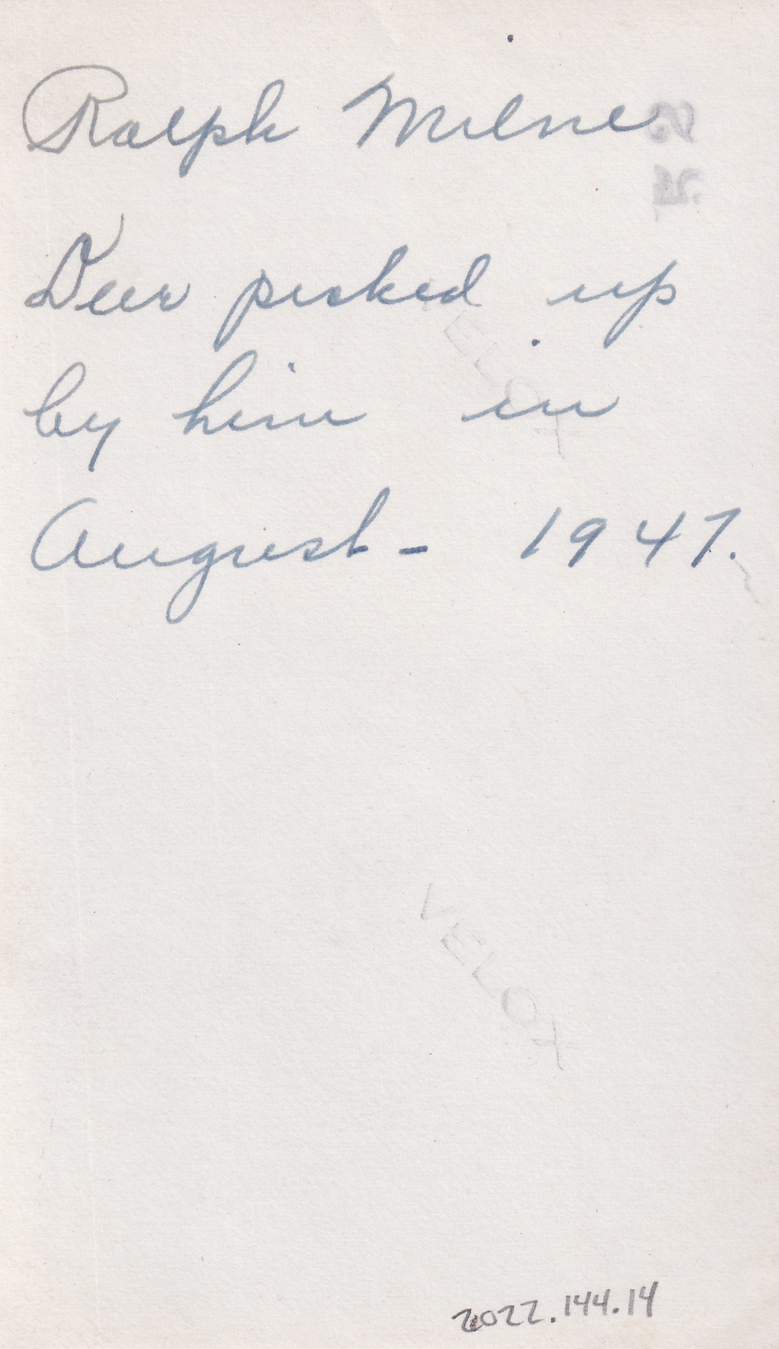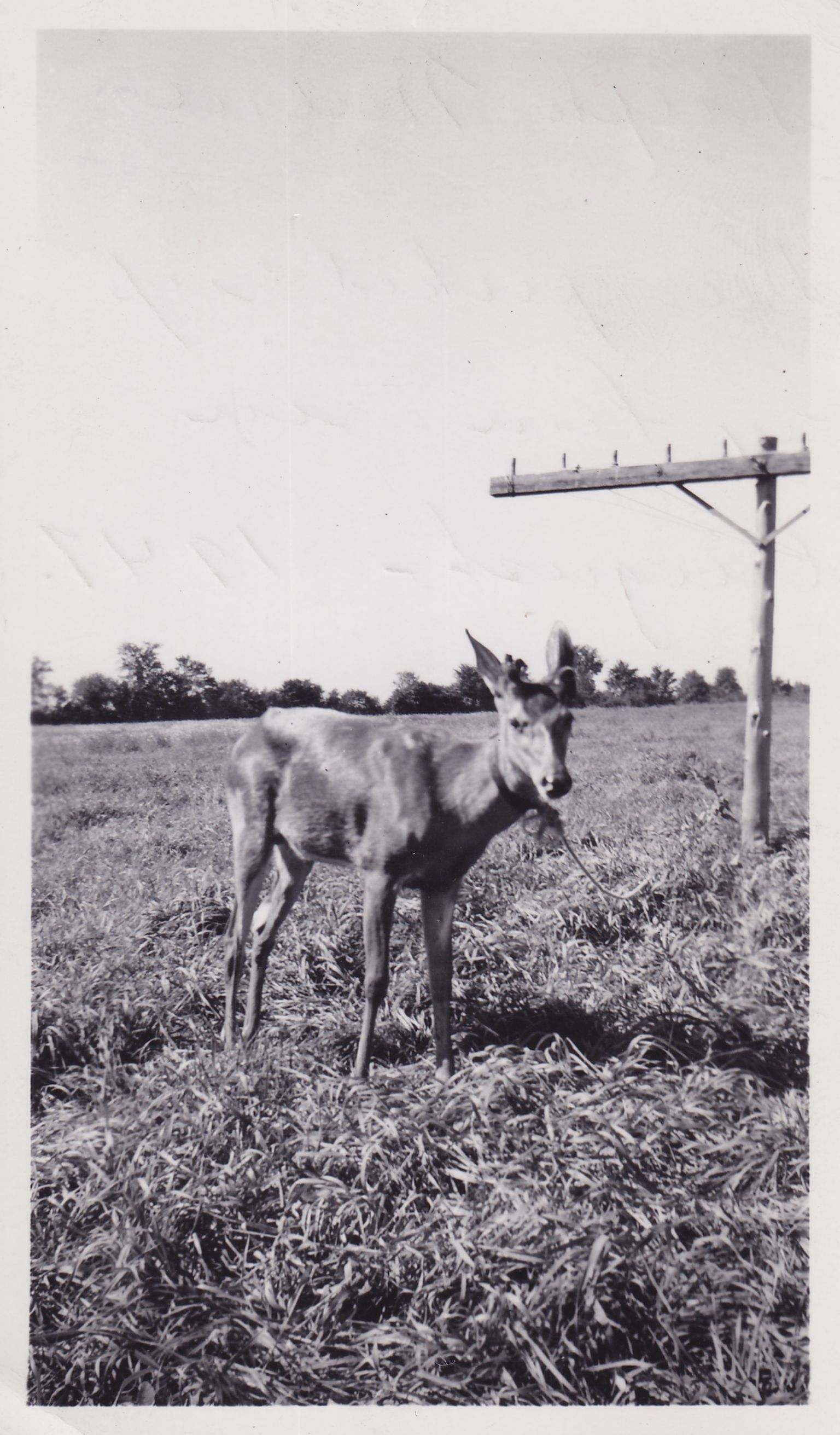 Black-and-White photograph of a deer on a rope lead standing in a field. Handwritten caption on back reads, "Ralph Milne, deer picked up by him in August - 1947."