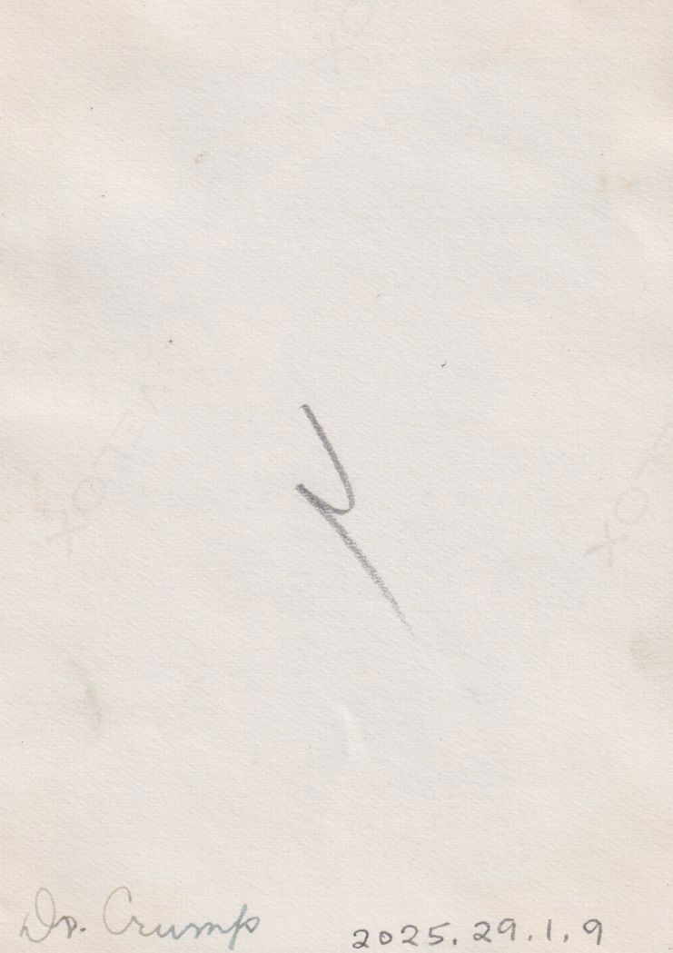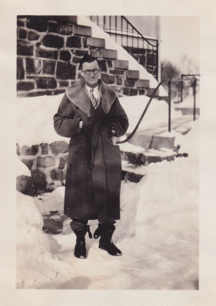 Black-and-White photograph of a man standing in the snow near the Laboratory Building at Trudeau Sanatorium. Handwritten note on reverse reads, "Dr. Crump."