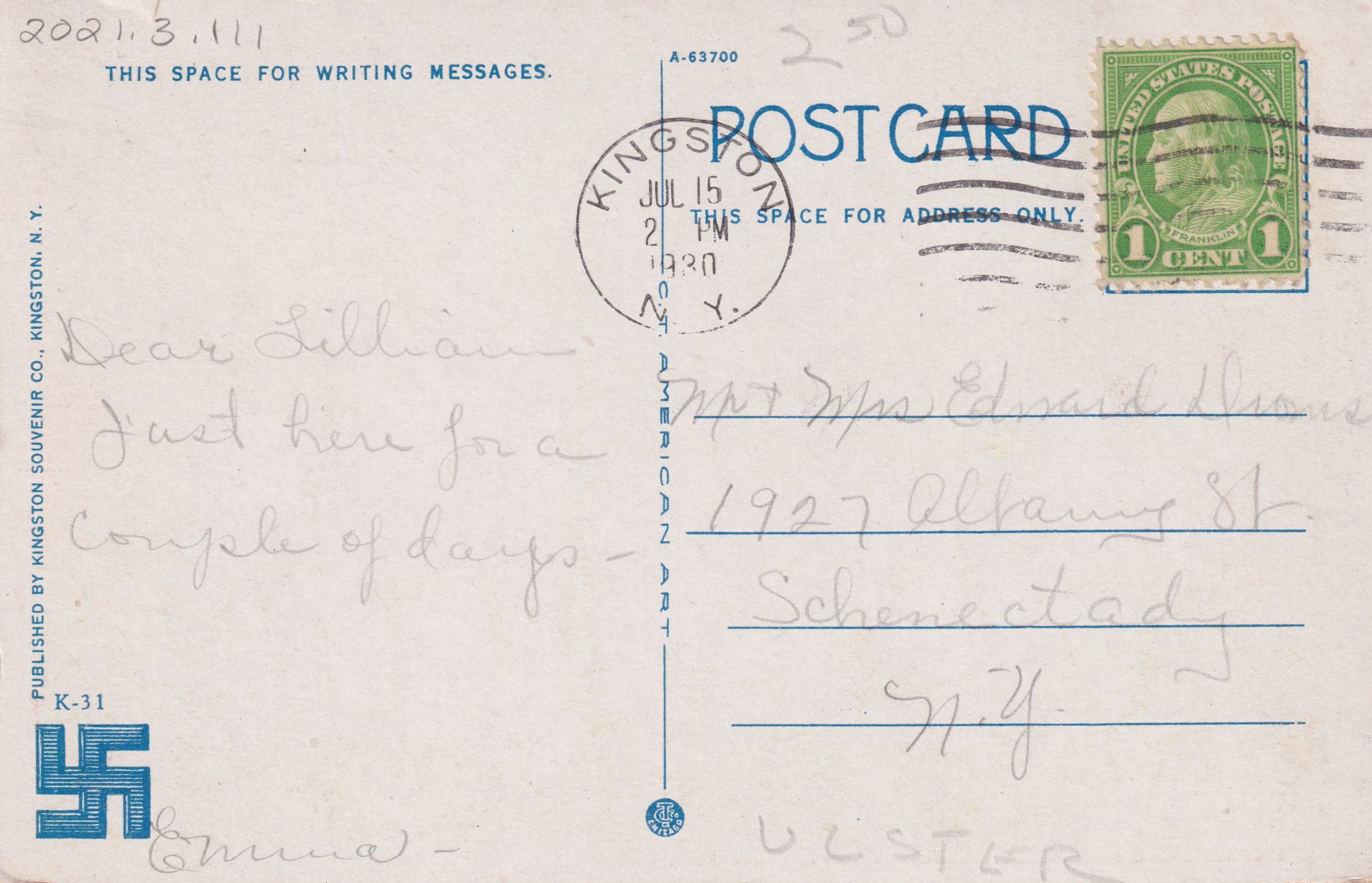 Color postcard showing a large, Second-Empire style building through the trees. Printed caption on the front reads, "Dr. Sahler's Sanitarium, North Front, Kingston, N.Y." Used, divided back, postmarked Kingston, NY, July 15, 1930. Printed by the Kingston Souvenir Co., Kingston, NY. Handwritten message on the back reads, "Dear Lillian, Just here for a couple of days - Emma." Mailed to Mr. & Mrs. Edward Droms [?], 1927 Albany St., Schenectady, NY, Ulster.Collection