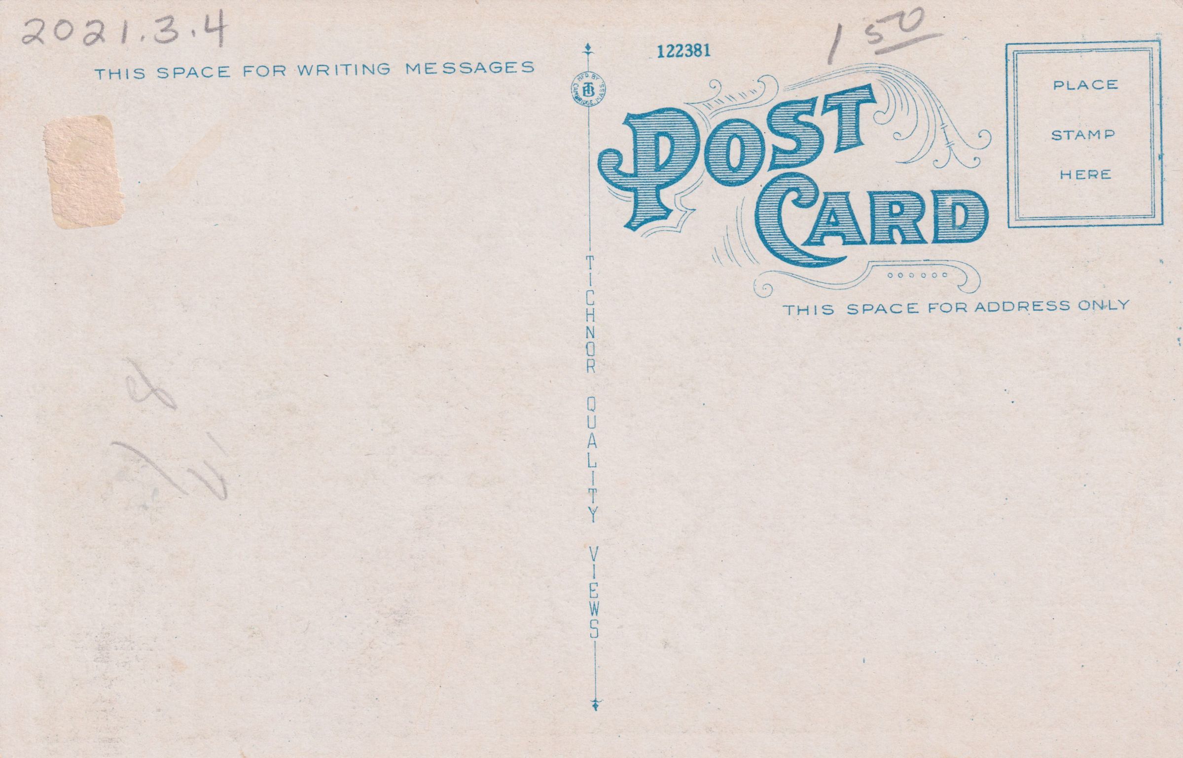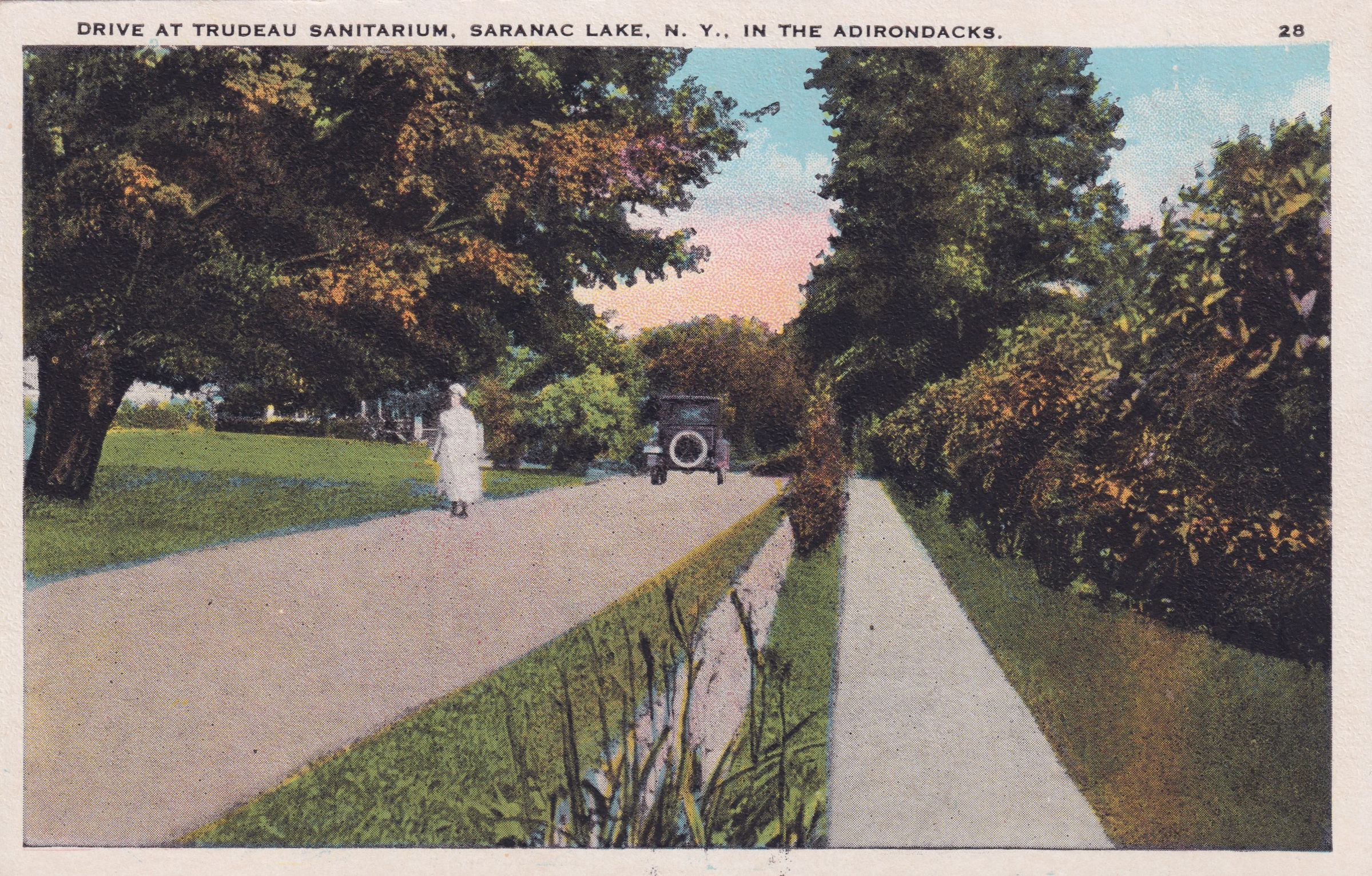 Color postcard of the main road through Trudeau Sanatorium, showing a woman walking toward the viewer and an early-model automobile driving away. Unused, divided back. Printed by Tichnor Quality Views. Caption on front reads, "Drive at Trudeau Sanitarium [sic], Saranac Lake, N.Y., in the Adirondacks."Subject Place