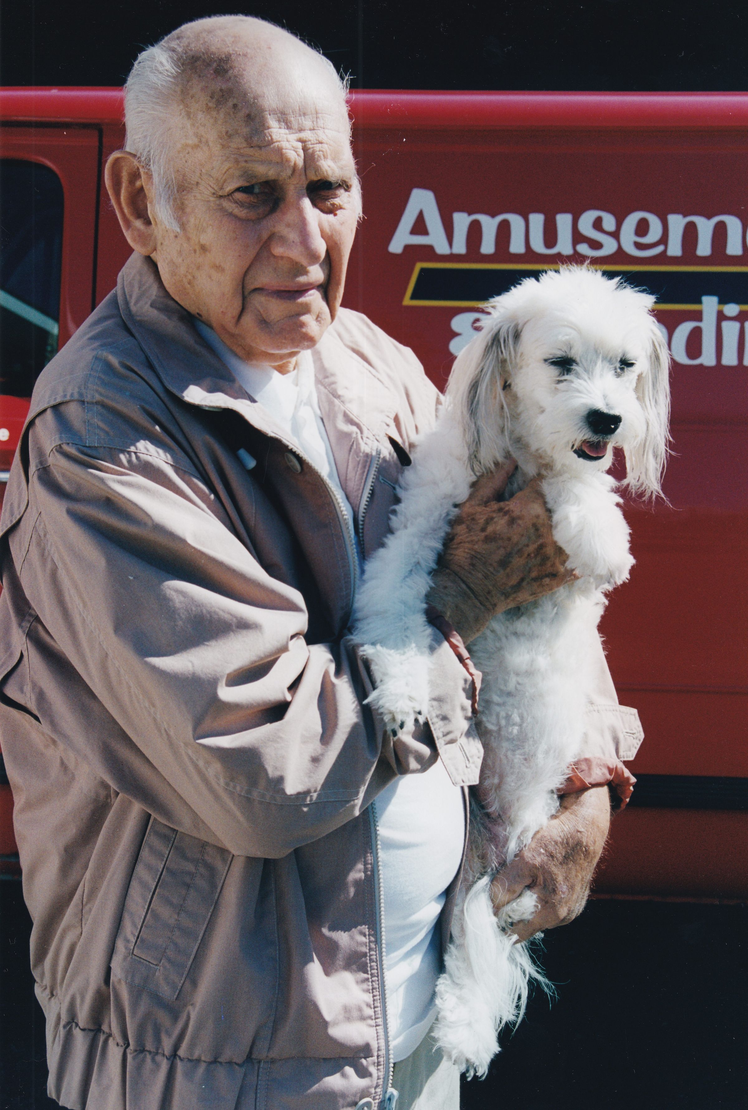 Color photograph of Earl Kinville and his dog Peka in front of a truck bearing the name of his business, Amusement & Vending. Portrait taken by Mary Lou Hanpeter Banks as part of her Soul Proprietor exhibition.