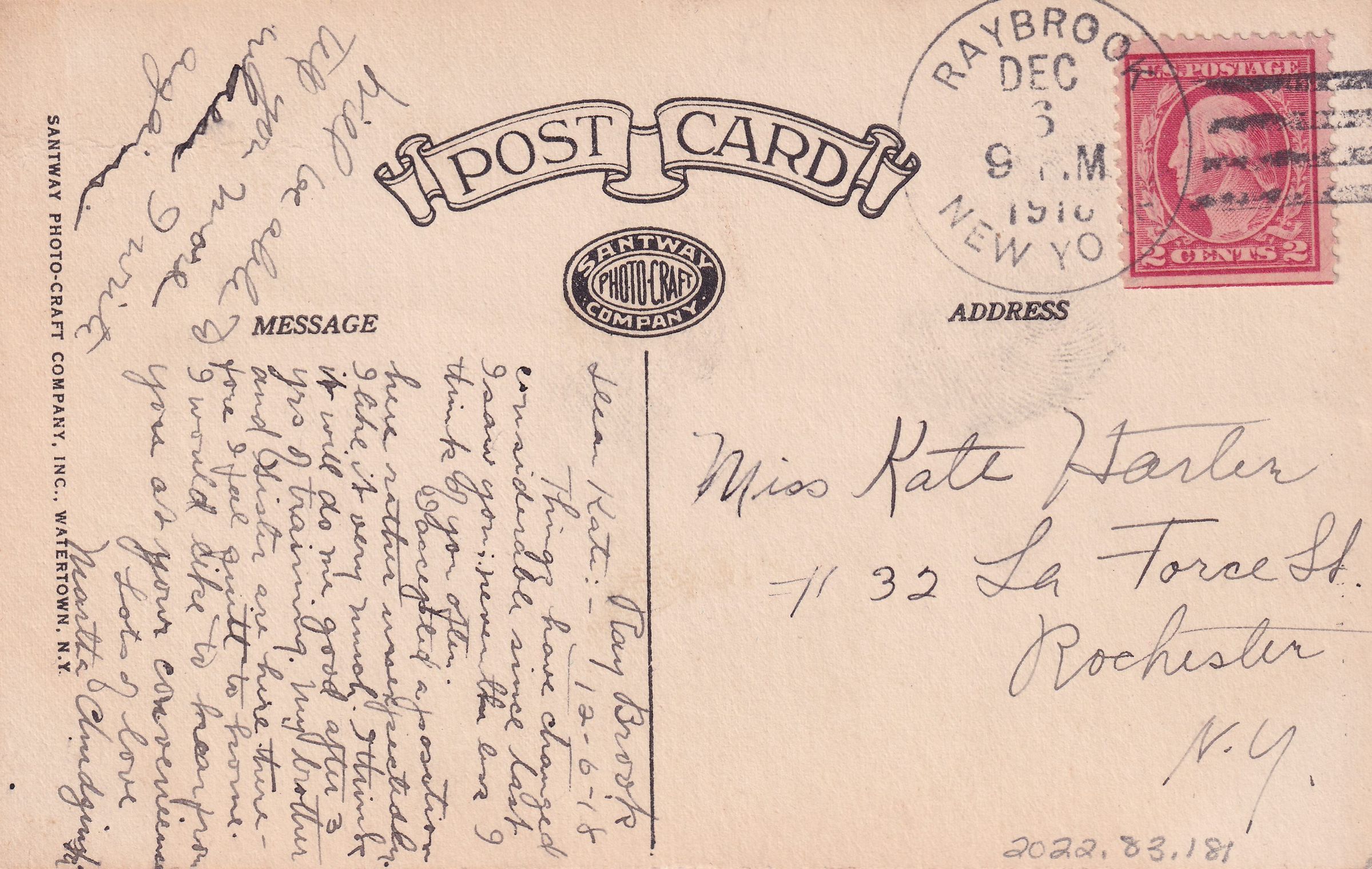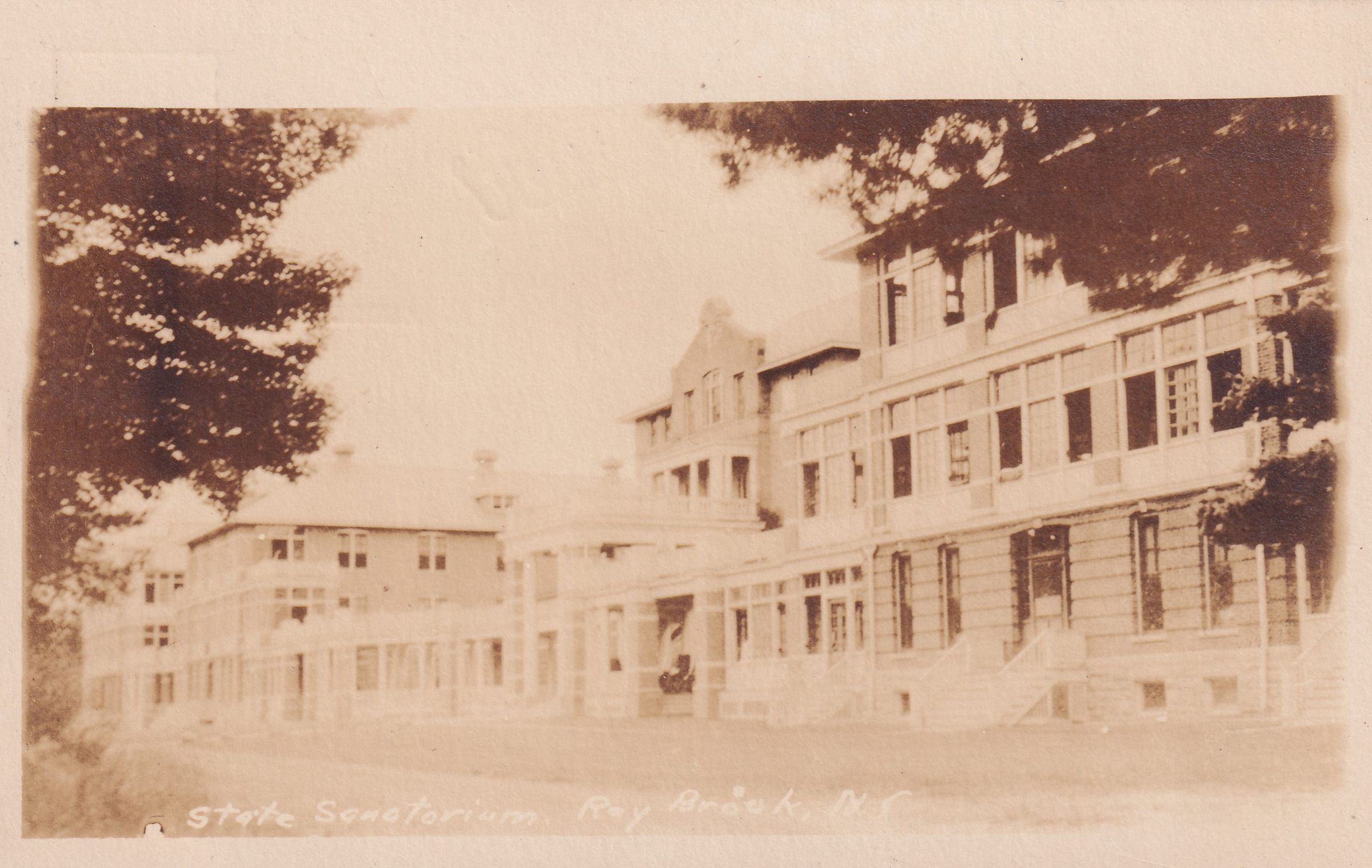 Photograph postcard showing a view of the Main Building at the New York State Sanatorium for Incipient Tuberculosis, AKA Ray Brook Sanatorium. Printed caption on front reads, “State Sanatorium, Ray Brook, N. Y.” Printed by Santway Photo-Craft Company, Watertown, NY. Used, divided back, white border, postmarked Ray Brook, NY, December 3, 1918. Handwritten message on back reads, “Ray Brook. 12-6-18. Dear Kate: Things have changed considerable since last I saw you; nevertheless I think of you often. I accepted a position here rather unexpectedly. I like it very much. I think it will do me good after 3 yrs of training. My brother and sister are here therefore I feel quite to home. I would like to hear from you at your convenience. Lots of love,. Martha [?] Will be able to tell you more when I write again." Mailed to Miss Kate Harter, 1132 La Force St,. Rochester, NY.Subject Place
