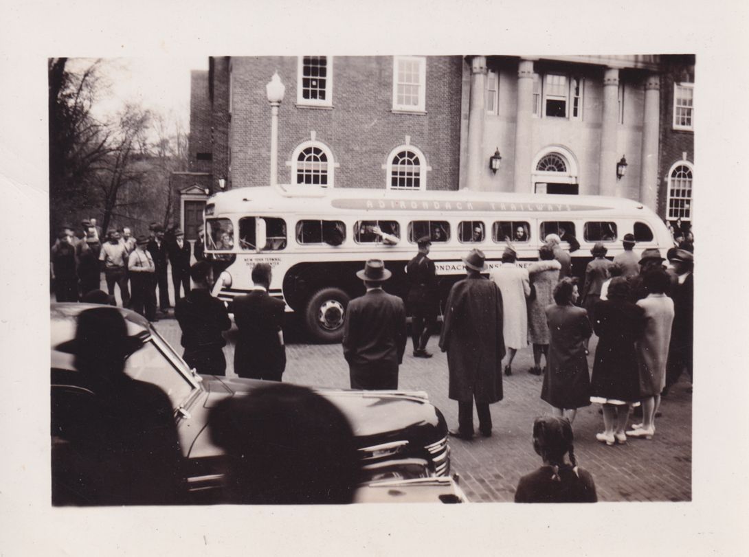 Black and white photograph of a bus in front of the Harrietstown Town Hall on Main Street. There are many people lining the sidewalk on the other side of the road, waving to the people on the bus.