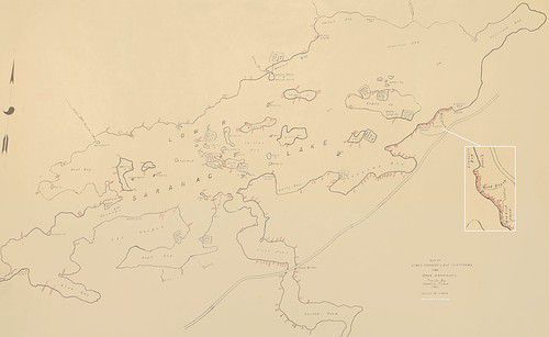 Map of Lower Saranac Lake Platforms and Open Campsites traced by Francis Pilon in 1961. Scale 12''=1 Mile. Platform numbers were hand printed in red ink.