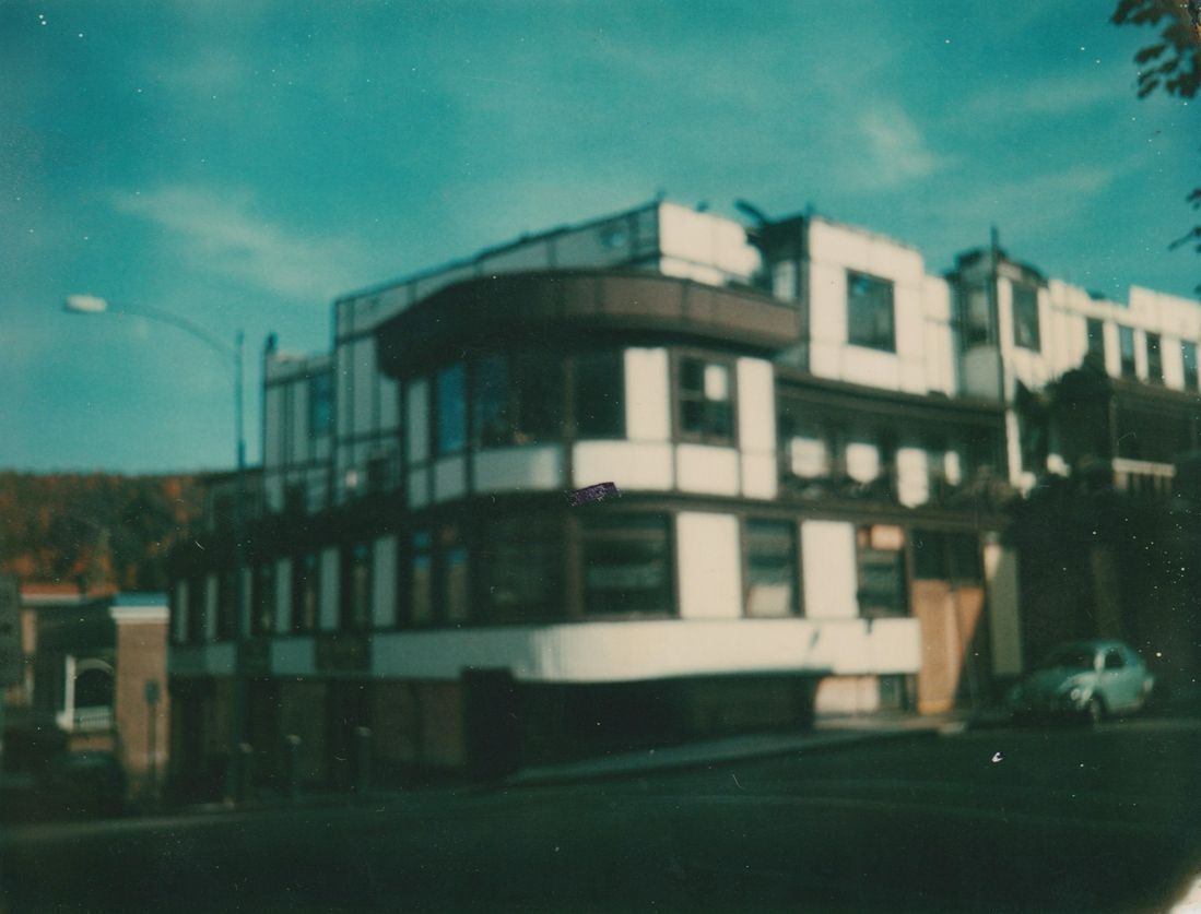 Photograph of the Berkeley Hotel after its second fire in January 1981. There is visible damage at the top of the building.