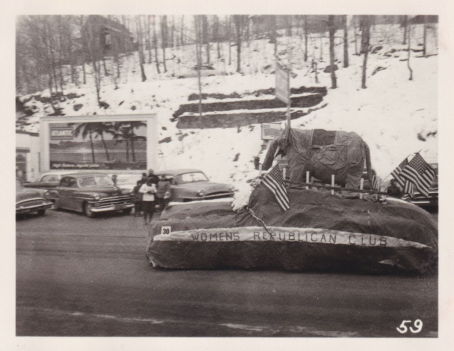 Black-and-White photograph of the Women’s Republican Club float in the 1957 Winter Carnival Parade on Broadway near the Fire Department. The float features a large sculpture of an elephant.