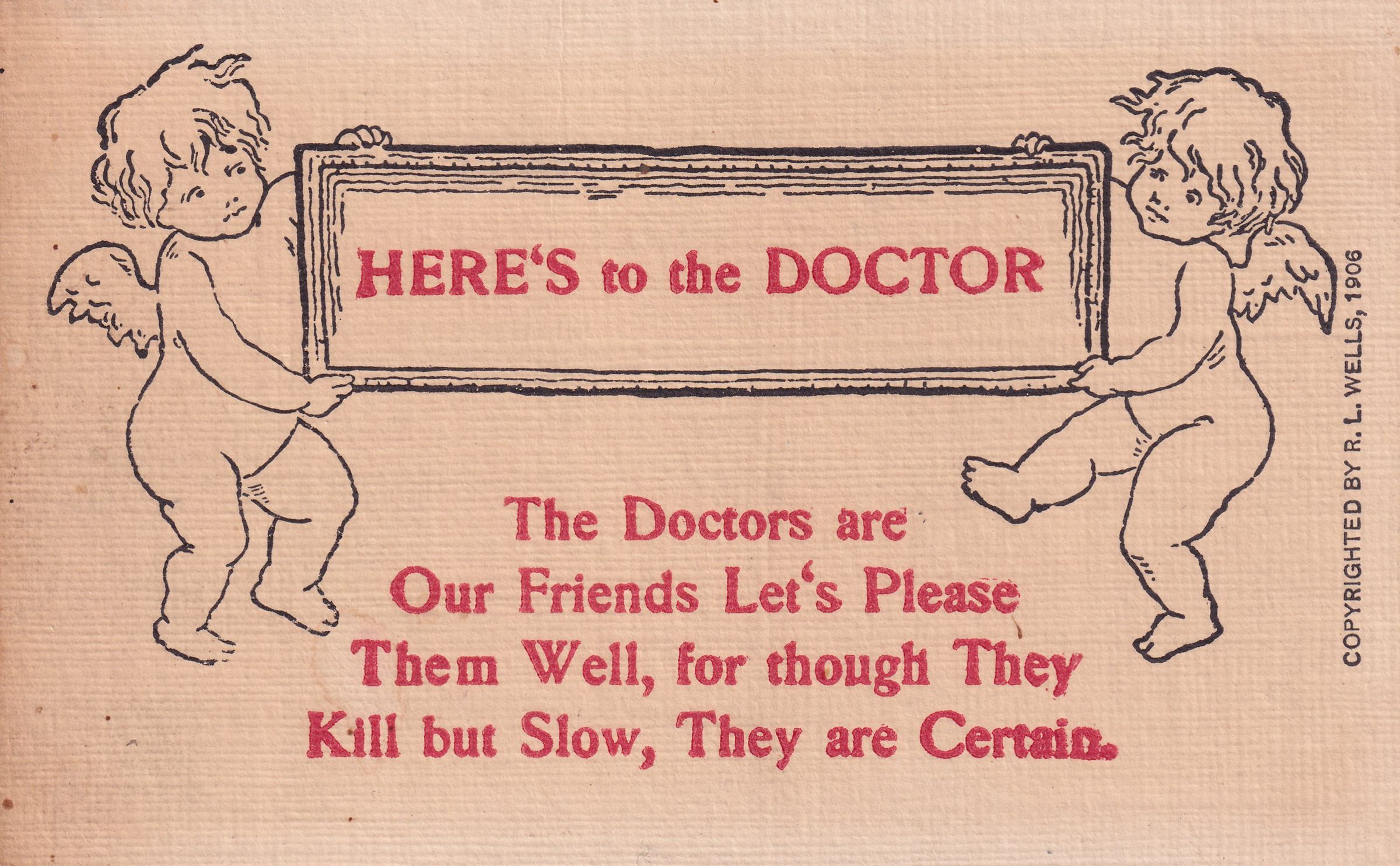 Postcard printed with black and red ink, with illustration of two cherubs holding a sign reading, “Here’s to the Doctor.” The remainder of the card reads, “The Doctors are Our Friends Let’s Please Them Well, for though They Kill but Slow, They are Certain.” Printed by R. L. Wells. Unused, undivided back.Collection