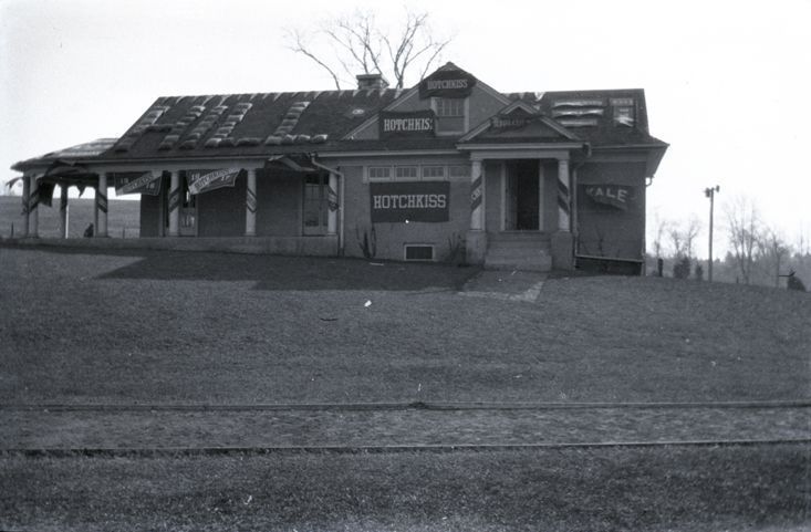 Negative of a building covered in "Hotchkiss" and "Yale" flags, with "Hill" written on the roof in cushions. Most likely taken by Mary Ives Baldwin. This item is not fully cataloged but has been uploaded so the image is publicly available; if you would like us to prioritize cataloging this item, please contact the HSL Collections team.