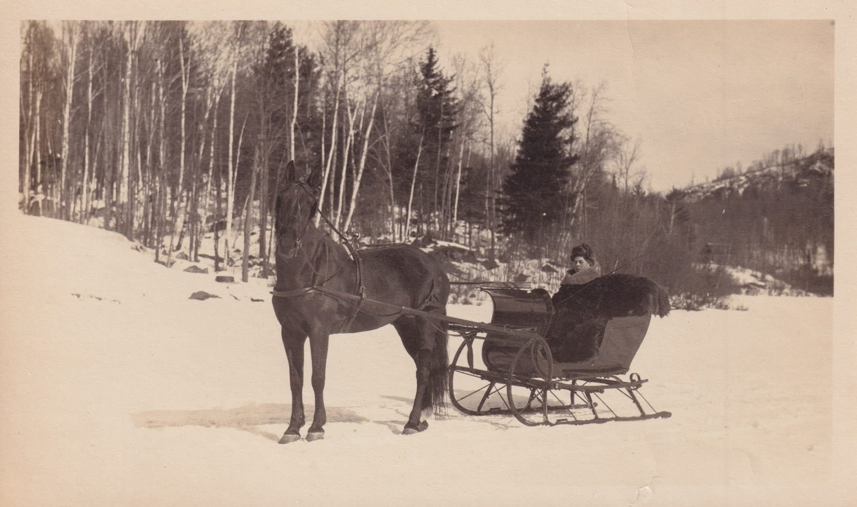 Black-and-White photograph of a person in a horse-drawn sleigh. Snowy trees and mountains can be seen in the background. The photograph was likely printed by Kollecker's Kodak and Gift Shop. [Note: this is the same photograph as 2024.2.199.]