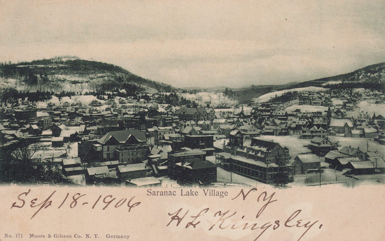 Black-and-White postcard showing a view of Saranac Lake from Blood Hill/Lake Street Hill. Printed caption on front reads, "Saranac Lake Village." Printed by Moore & Gibson Co., NY. Used, undivided back, white space at bottom front for message, not mailed. Handwritten message on front reads, "Sep 18, 1906. NY. H. L. Kingsley."Subject Place