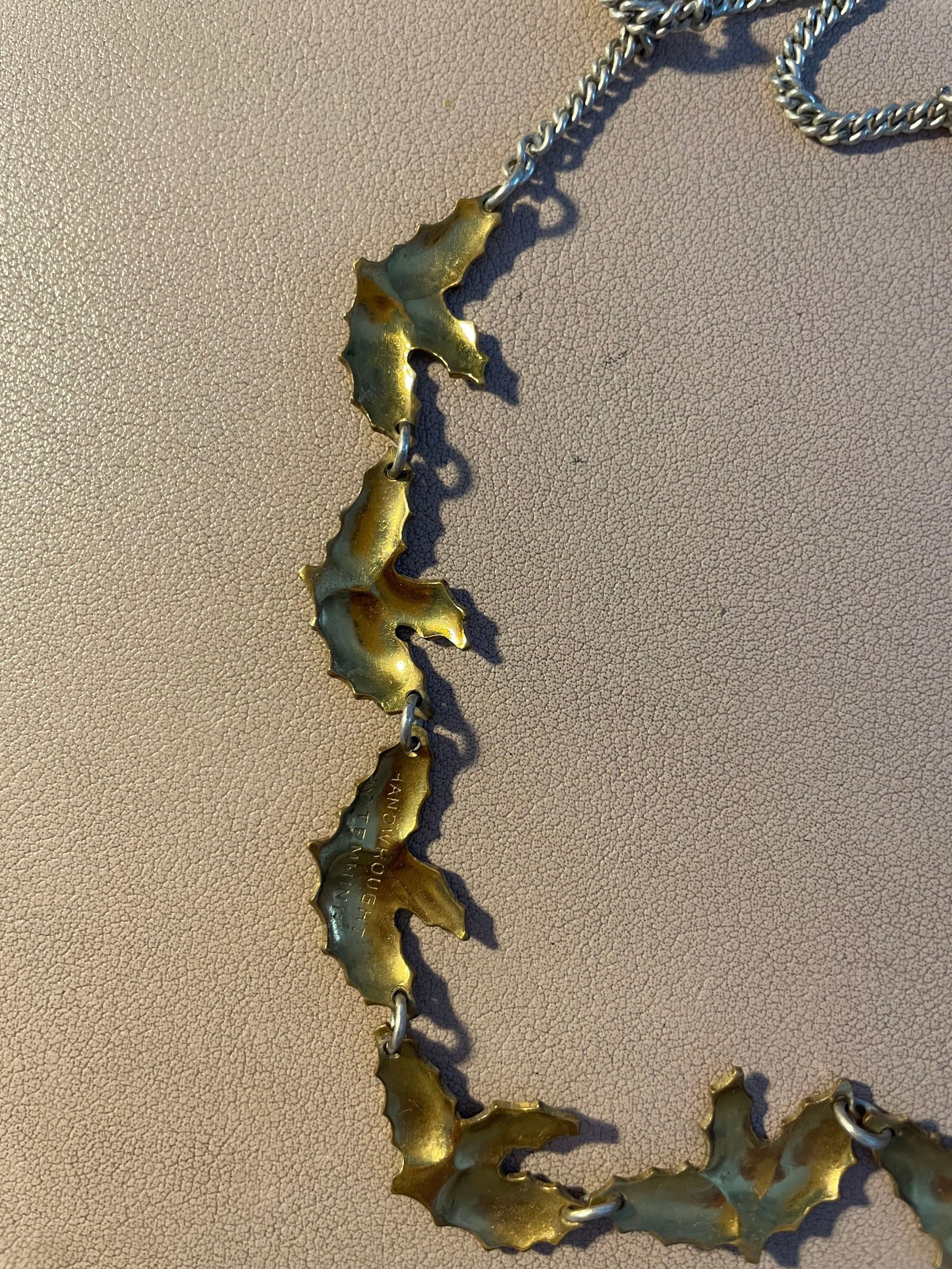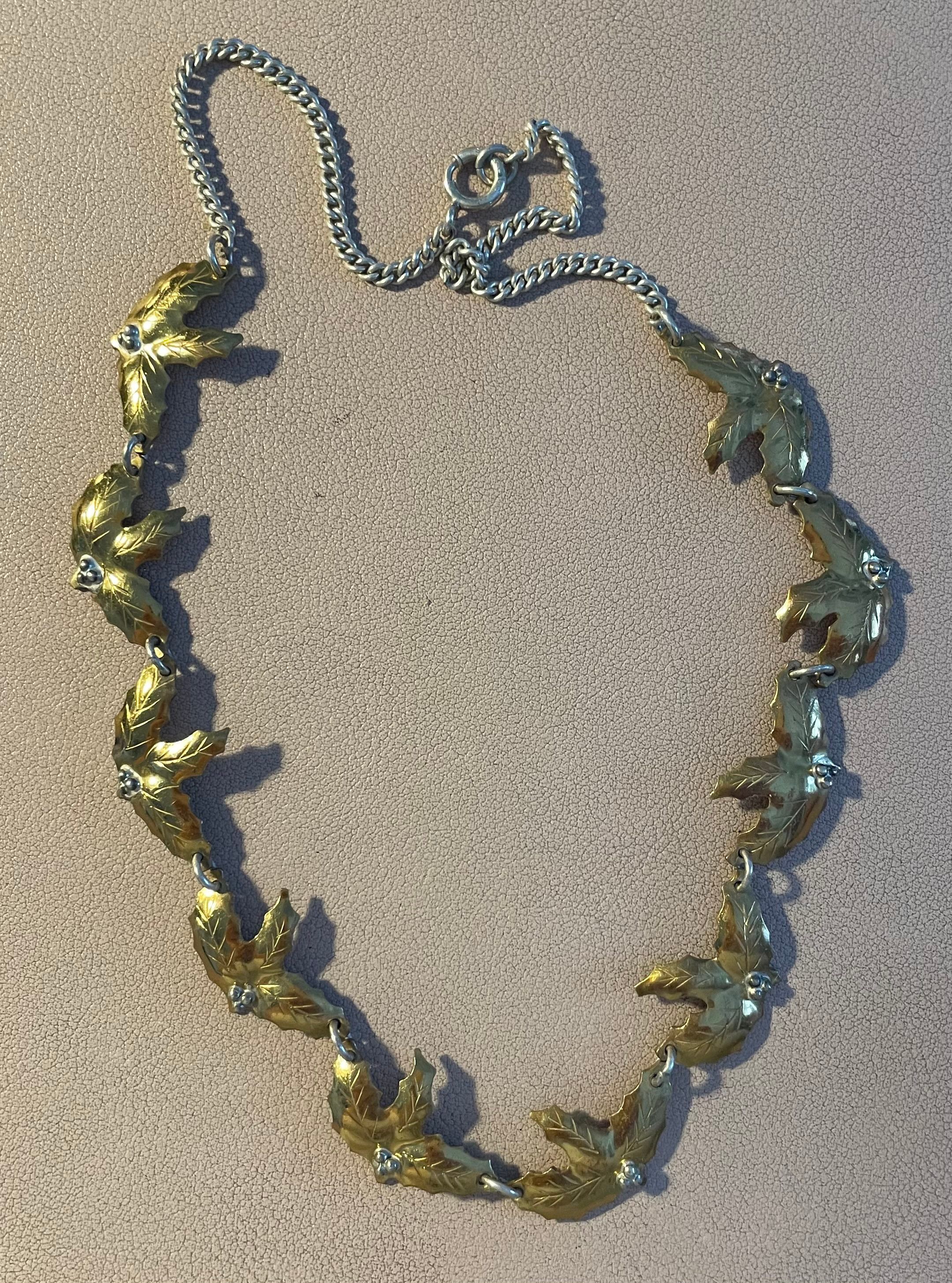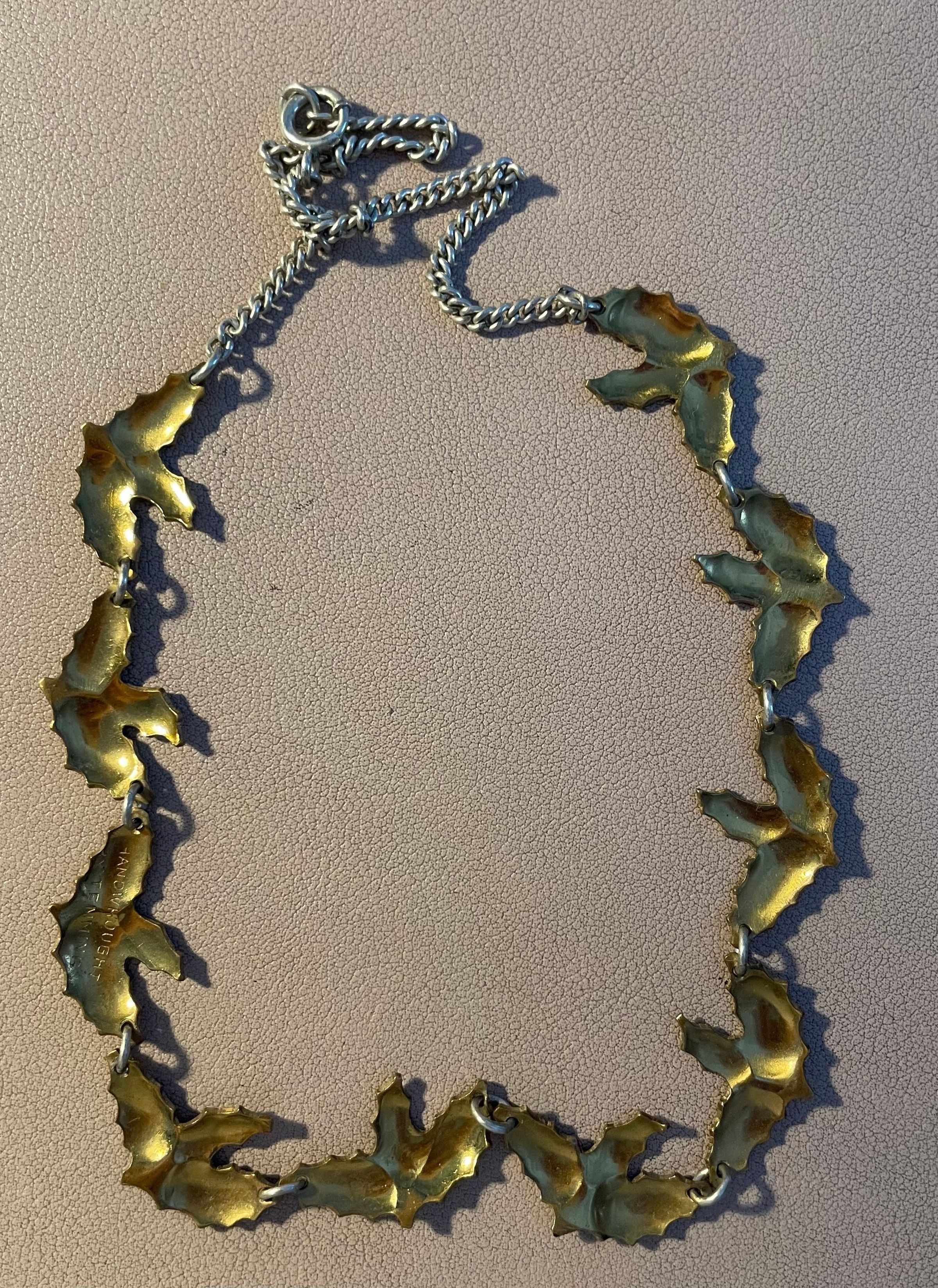 Brass/gold necklace with holly and berry motif. Necklace is made of 10 sets of holly leaves joined with rings, and suspended from a chain. Berries on holly are silver plated. Stamped "Handwrought by Temming," on reverse of one of the leaves.