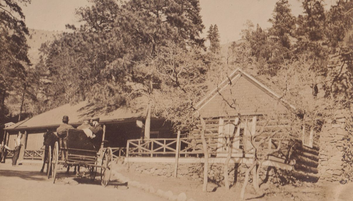 Black-and-white photograph of a house with a log cabin facade on part of it. There is a horse-drawn buggy on the road in front of the house. There is a wooden fence around the house, standing on a short retaining wall made of stone.