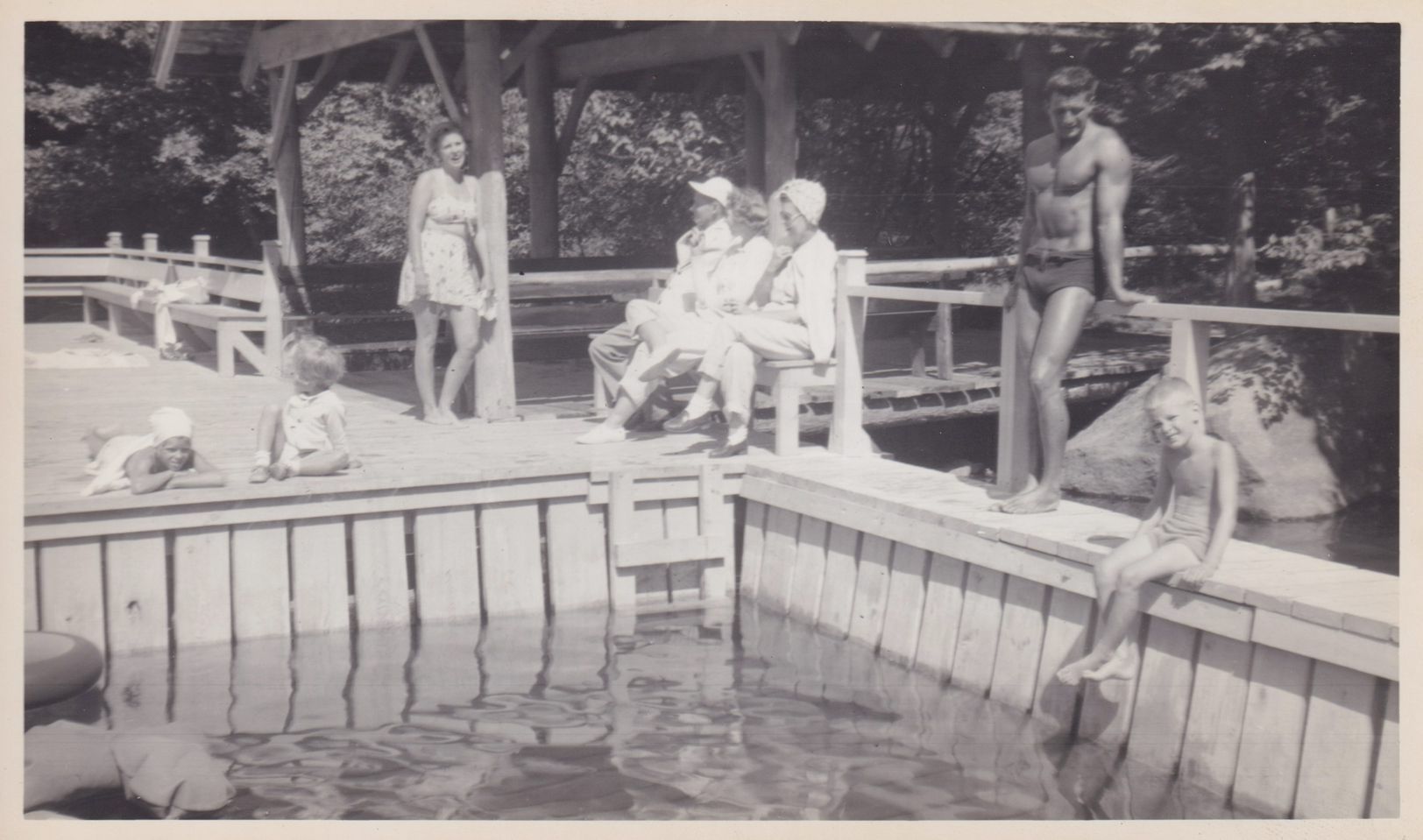 Black-and-White photograph of a group of unidentified people, mostly wearing swimsuits, on a dock at the Bartlett Carry Club.