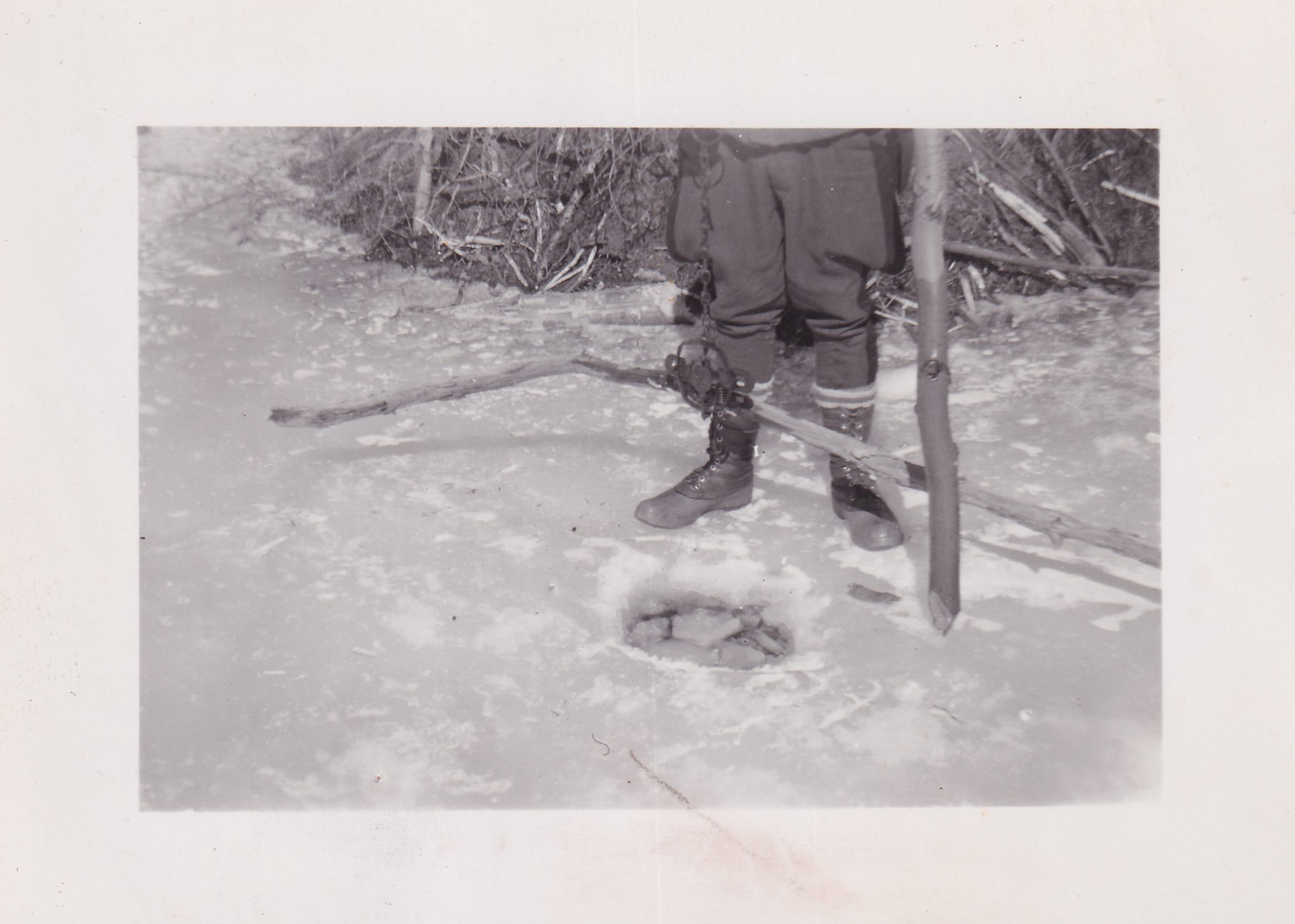 Black-and-White photograph showing a beaver trap next to a hole in the ice. A pair of feet and the base of a beaver dam can be seen in the background.