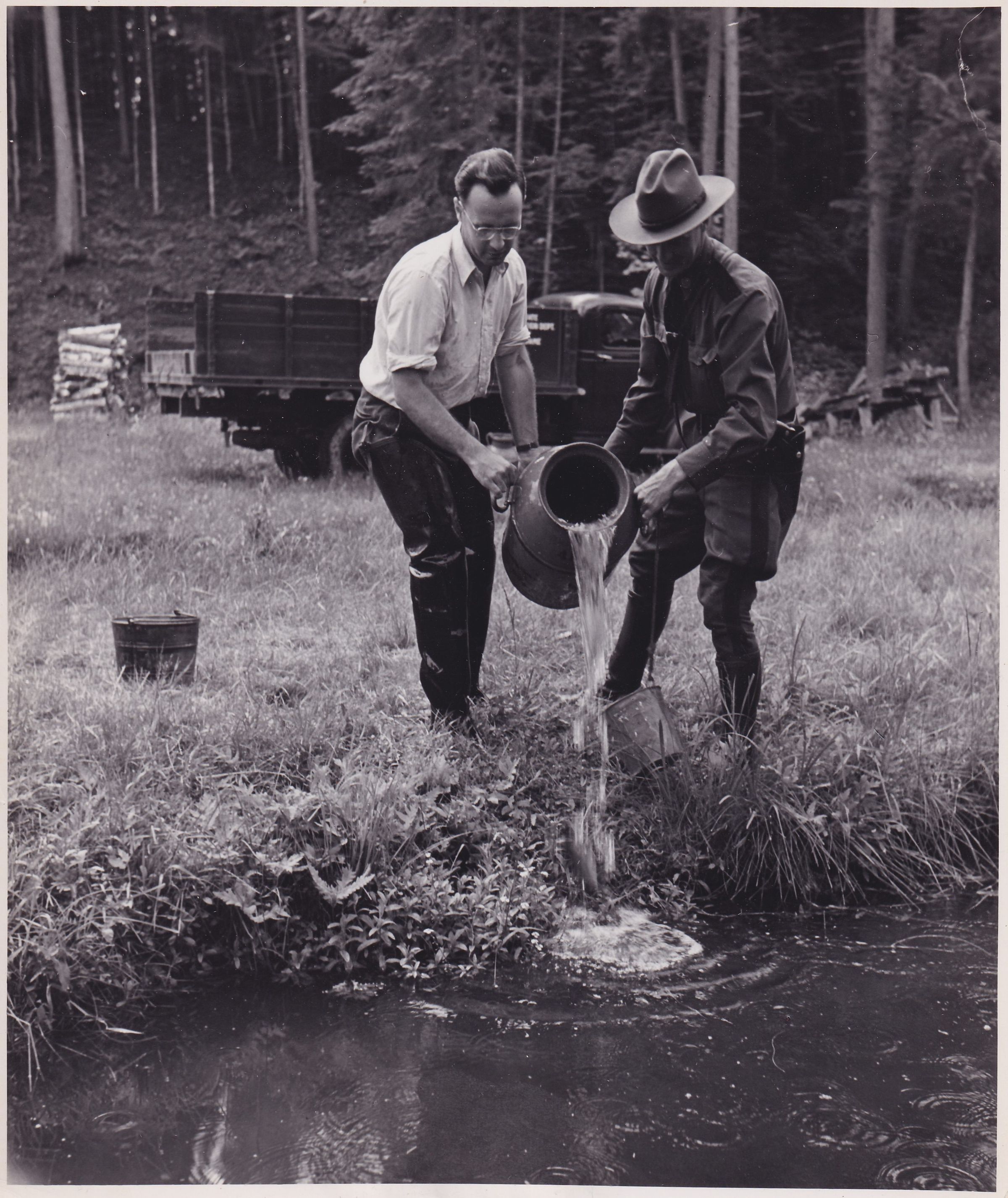 Black-and-White photograph of a man in a game warden uniform helping another man dump a large container of fish into a body of water.