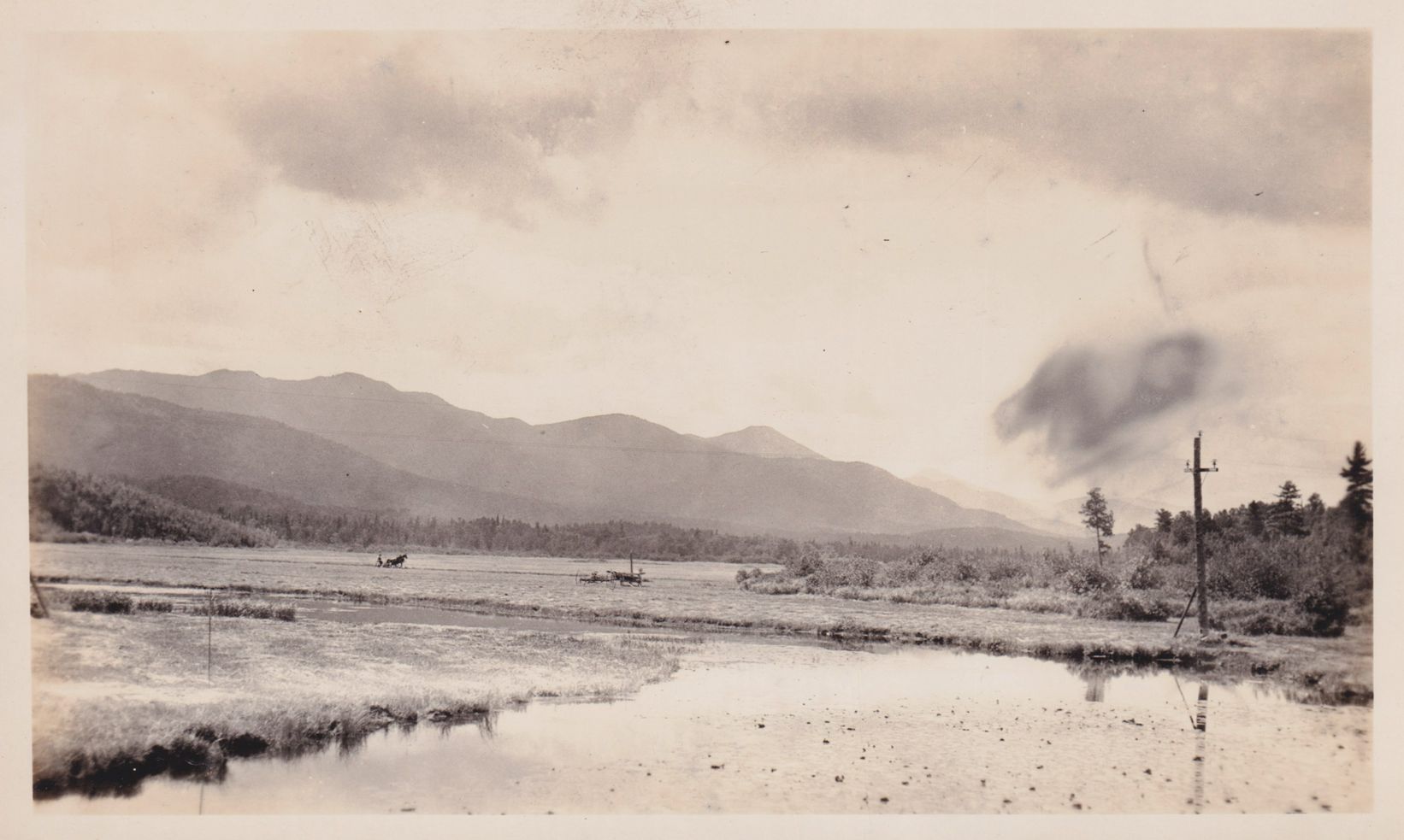 Black-and-White photograph of an unidentified river or body of water. A person is driving a horse-drawn plow or other farming equipment on the other side of the river. A mountain can be seen in the distance. The photograph was likely printed by Kollecker's Kodak and Gift Shop.