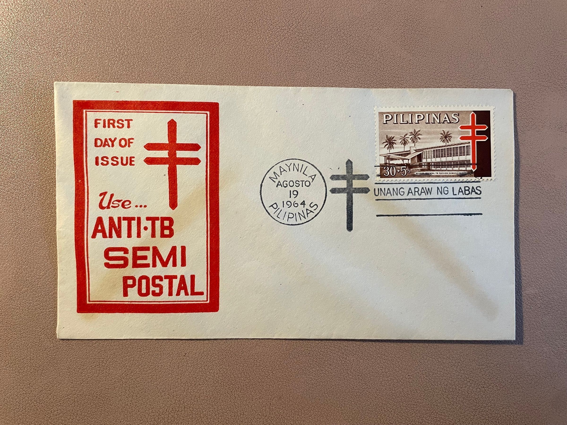 Envelope for first day of issue for stamp featuring Negros Oriental TB Pavilion, Dumaguete City, in the Philippines. Envelope has red graphic reading, "First Day of Issue. Use... Anti-TB Semi Postal," with double-barred cross. Canceled in Manila, August 19, 1964. Envelope has not been used.