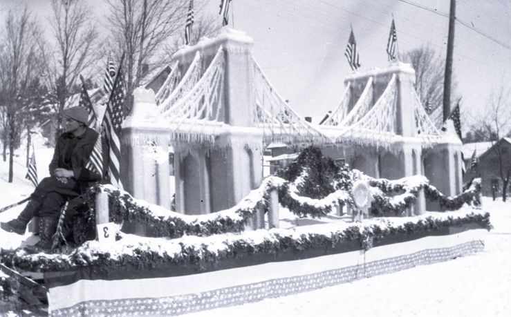 Negative of a Winter Carnival parade float shaped like a suspension bridge, maybe the Brooklyn Bridge, covered in ice. There are American flags at the top and sides of the float, and one man sitting on the back. Most likely taken by Mary Ives Baldwin. This item is not fully cataloged but has been uploaded so the image is publicly available; if you would like us to prioritize cataloging this item, please contact the HSL Collections team.